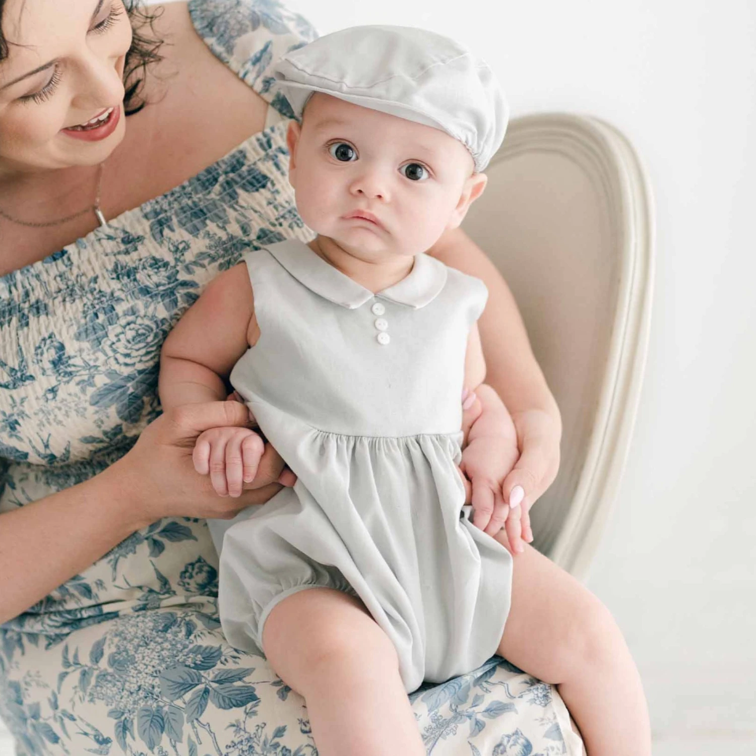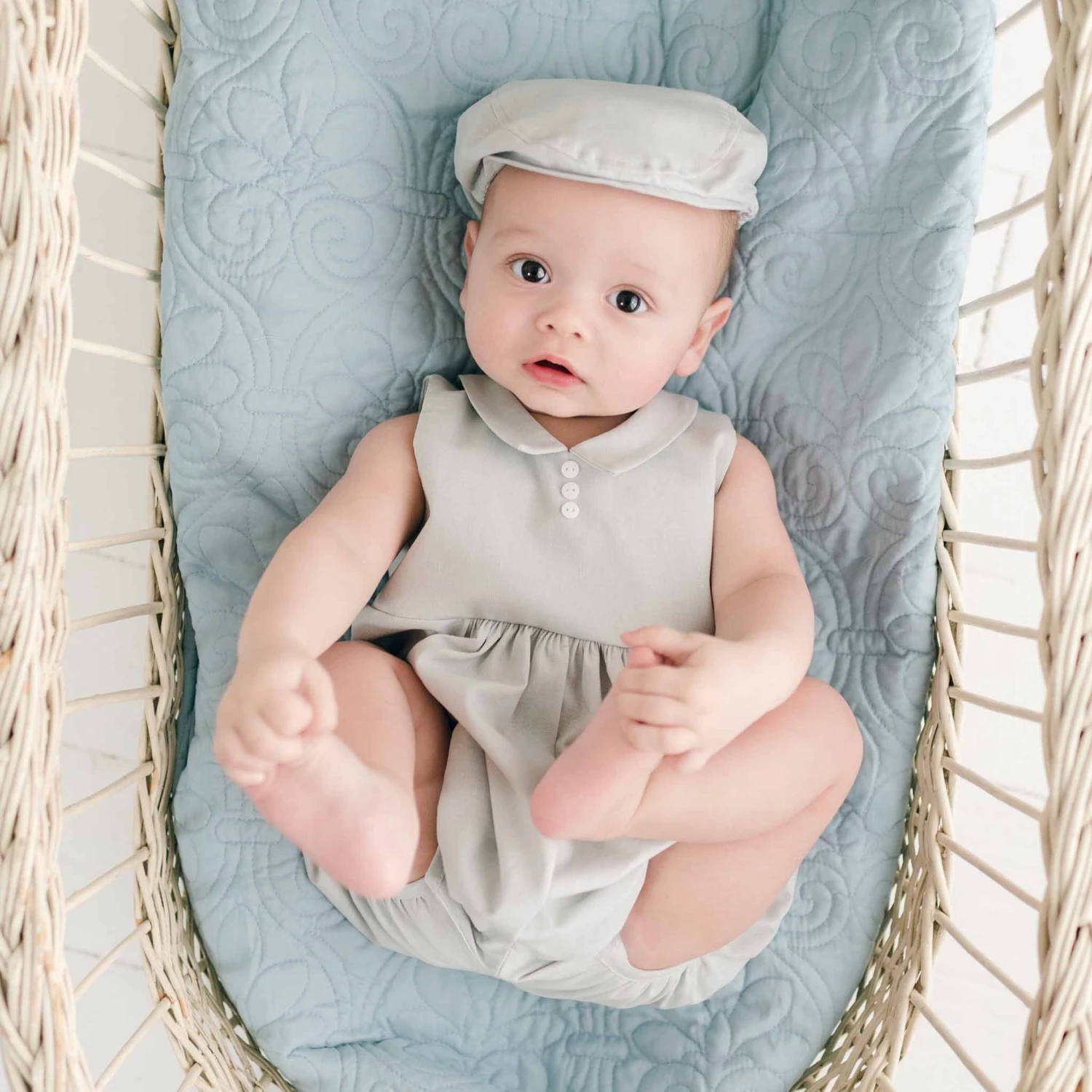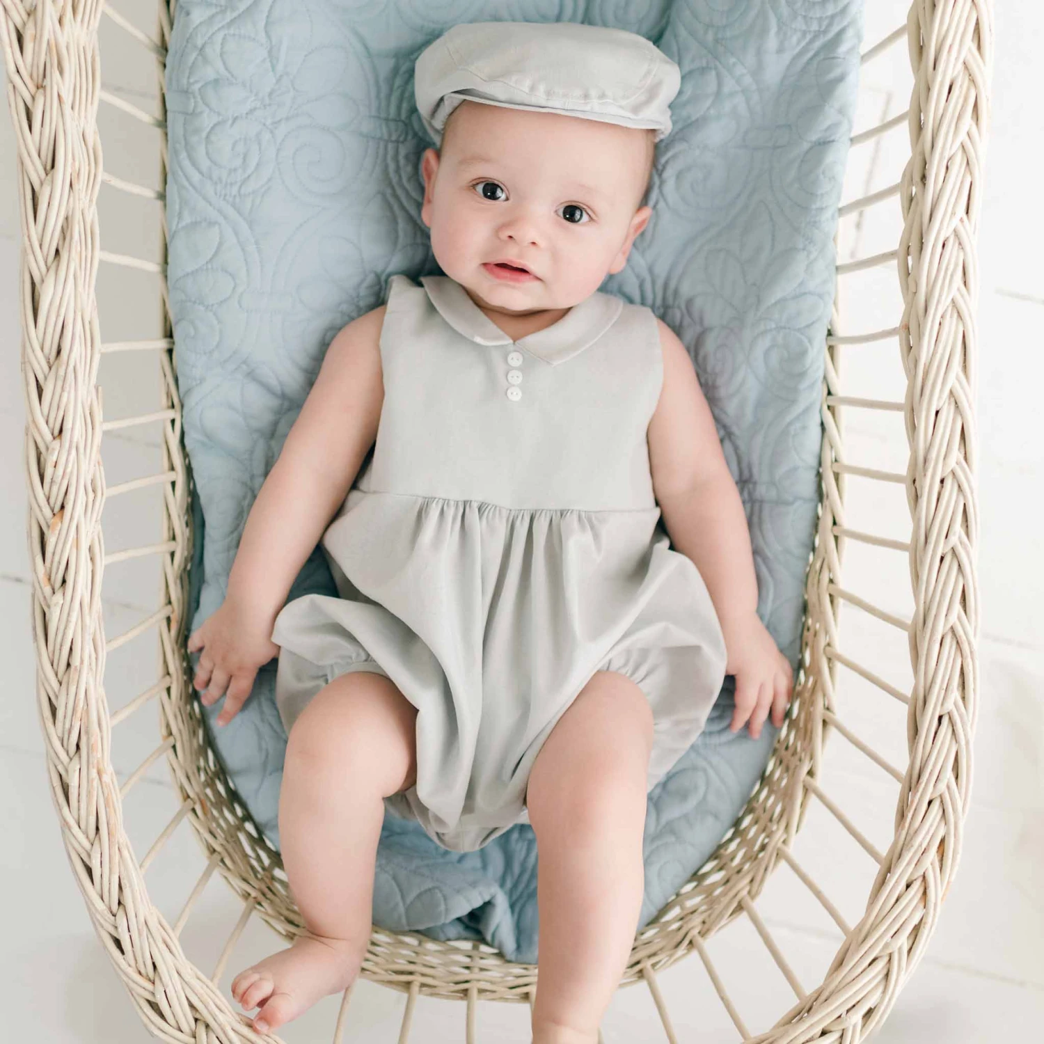 A handsome collared linen bubble romper perfect for any party or celebration! Made with a soft linen cotton blend in grey, features snaps along the legs and summarys on the back allow for easy changes. A pointed collar and summary detail on the front add a special touch. Designed to fall between baby’s knee and mid-thigh, this sweet bubble romper can be paired with the matching linen newsboy and any of our Grayson accessories to complete his look from head to toe!