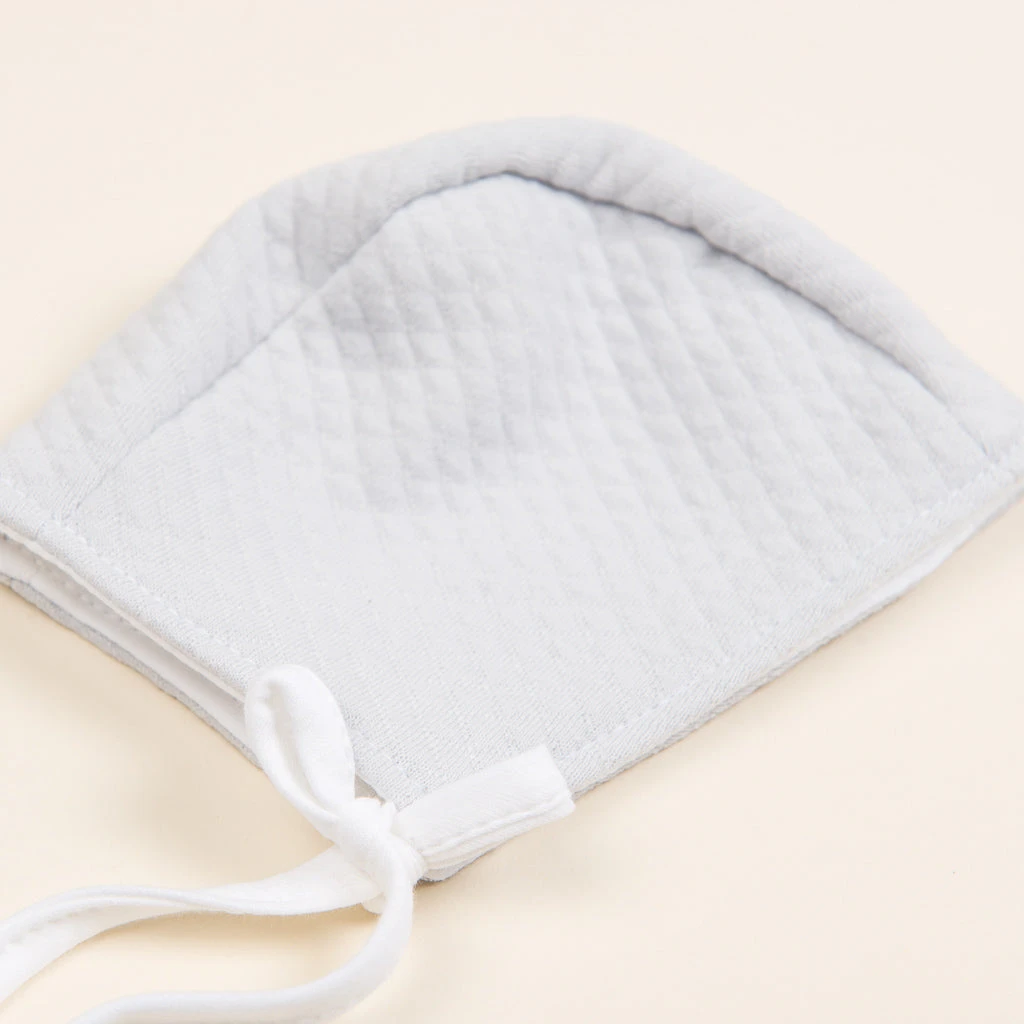 This timeless baby bonnet is the perfect finishing touch to a take home outfit. Made with our soft quilted cotton in grey, it is lined in super soft white Pima cotton for extra comfort, yet is simply styled for any newborn outfit. White Pima ties under the chin allow for a comfortable fit. An adorable traditional baby bonnet to keep your newborn baby warm and styled.