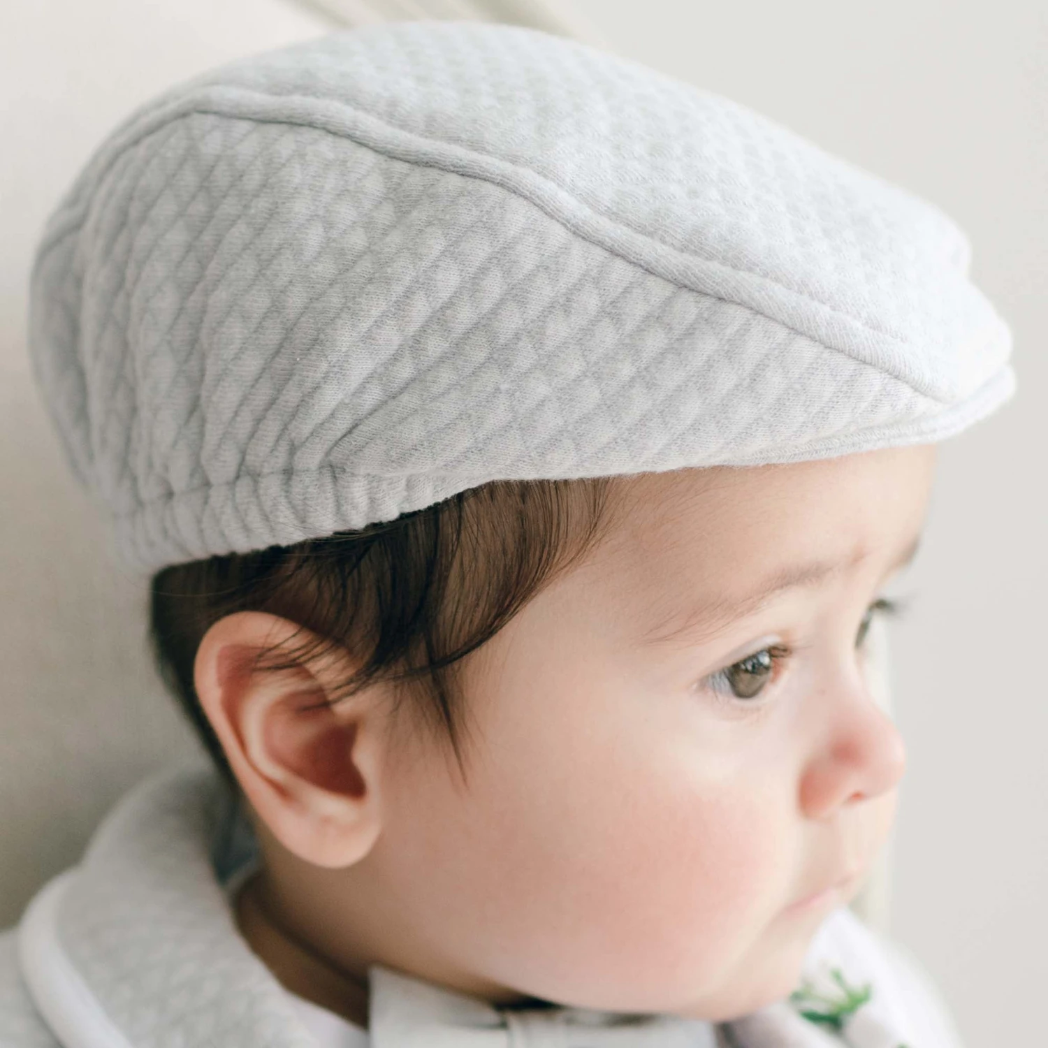 Made with our super soft grey quilted cotton, the Asher Grey quilted newsboy cap is a perfect match! The charming newsboy style baby hat is finished with a soft elastic along the back to ensure a nice, comfortable fit. Pair with the Asher Grey booties and blanket to complete your little prince’s look from head to toe!
