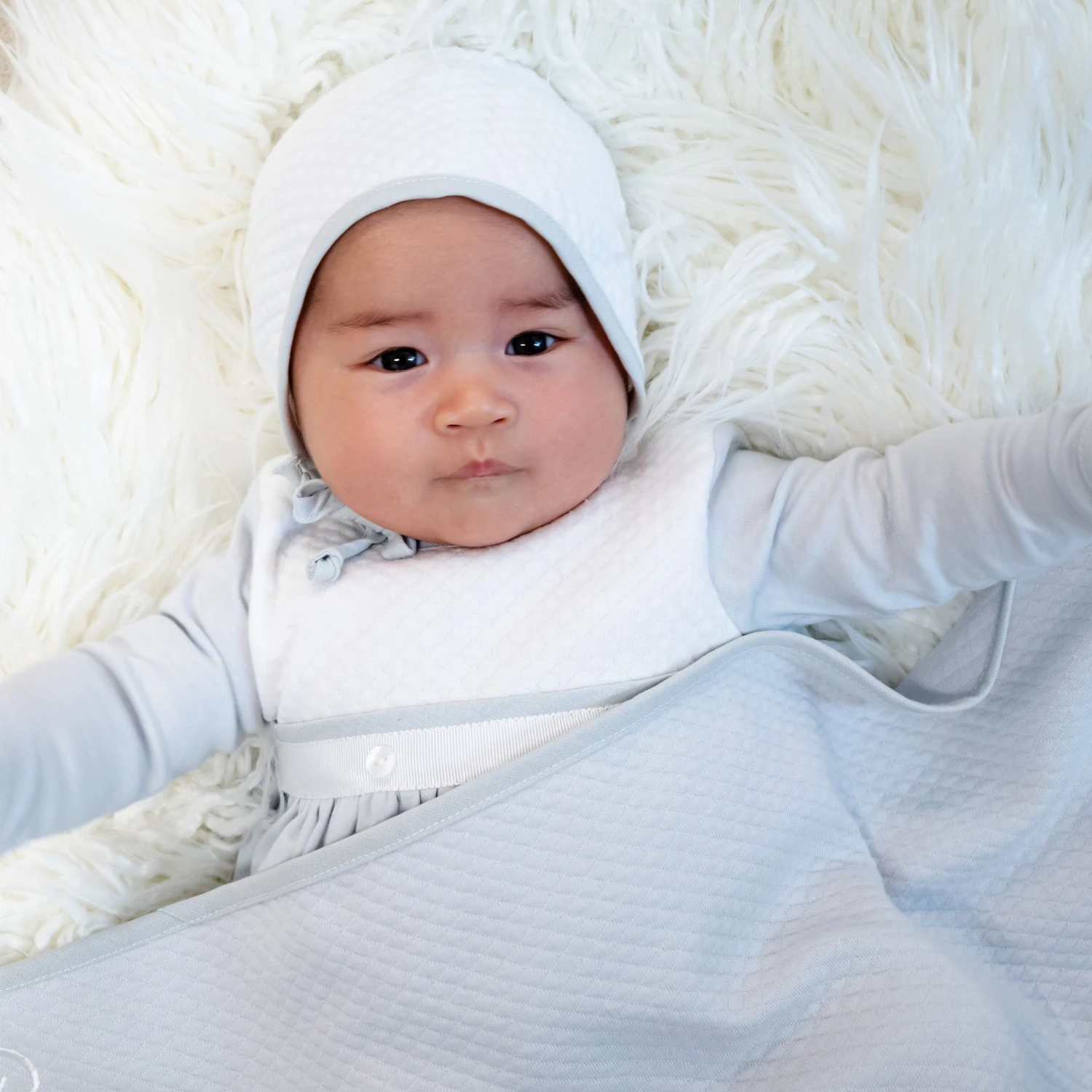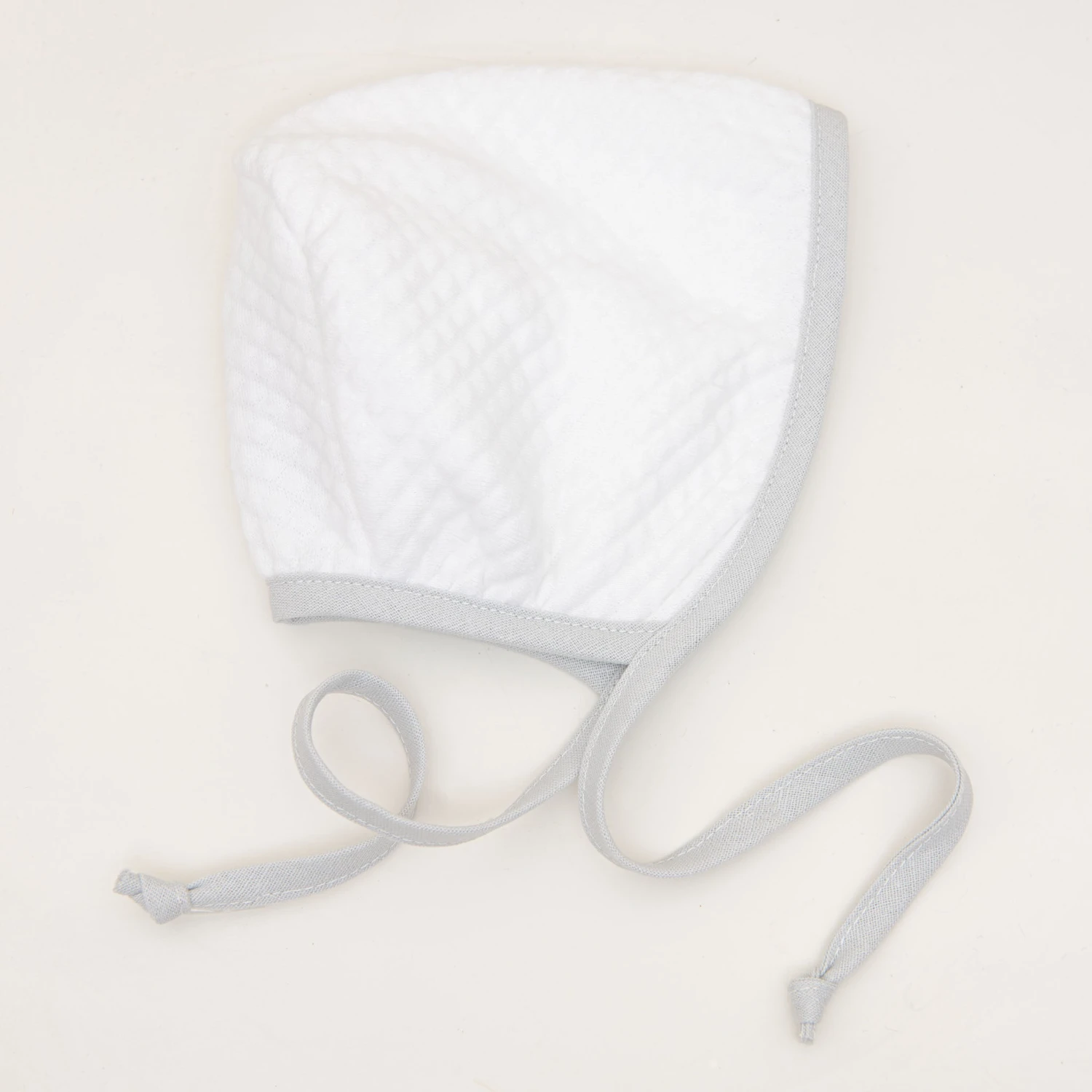 This vintage inspired boys baby bonnet is the perfect finishing touch to his take home outfit. Made with our soft quilted cotton in white, it is trimmed in light grey linen so it matches his Grayson newborn gown and romper, yet is simply styled for any coming home outfit. Grey linen ties under the chin allow for a comfortable fit. An adorable traditional baby bonnet to keep your newborn baby warm and styled.