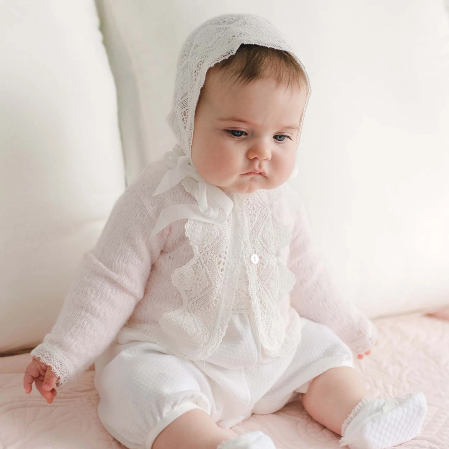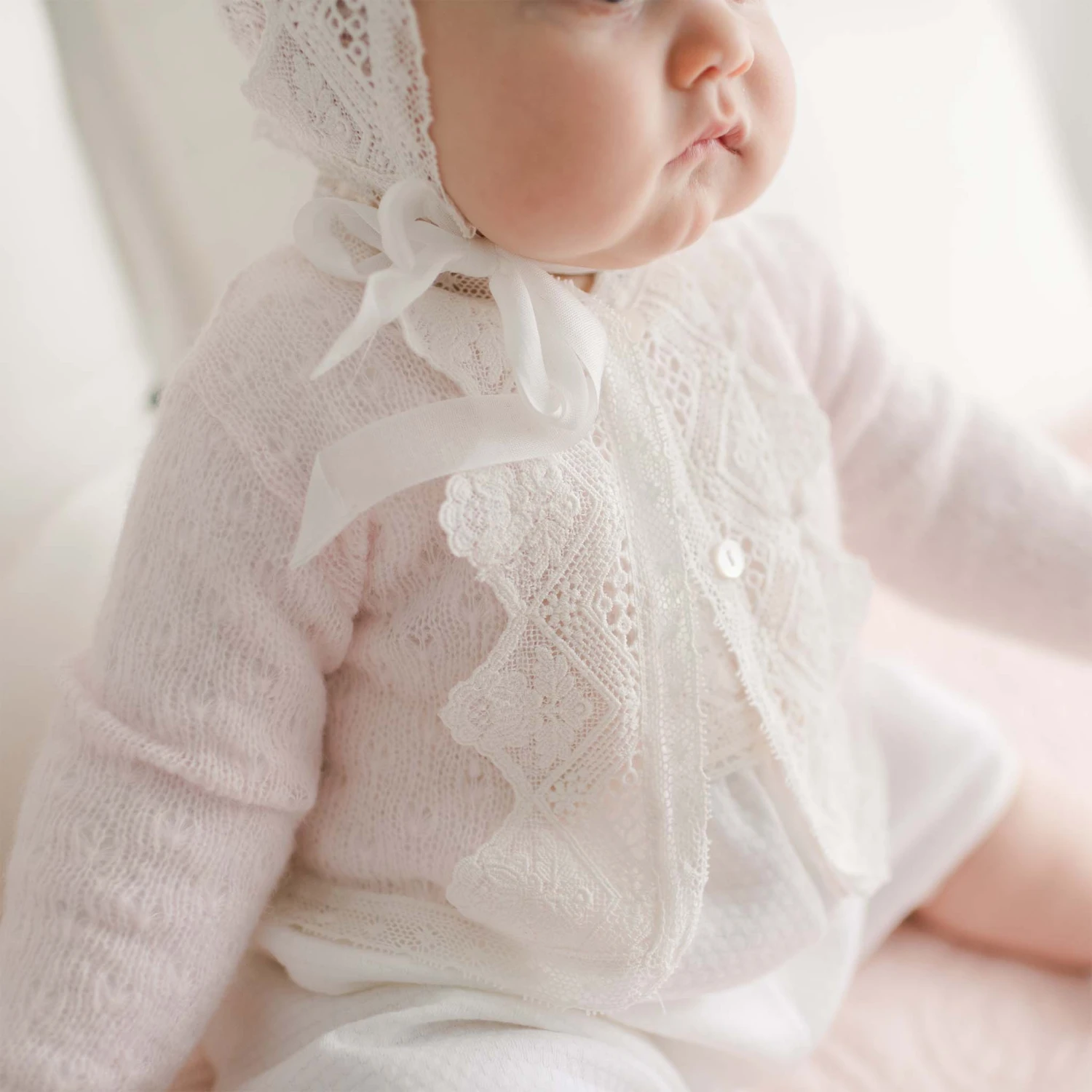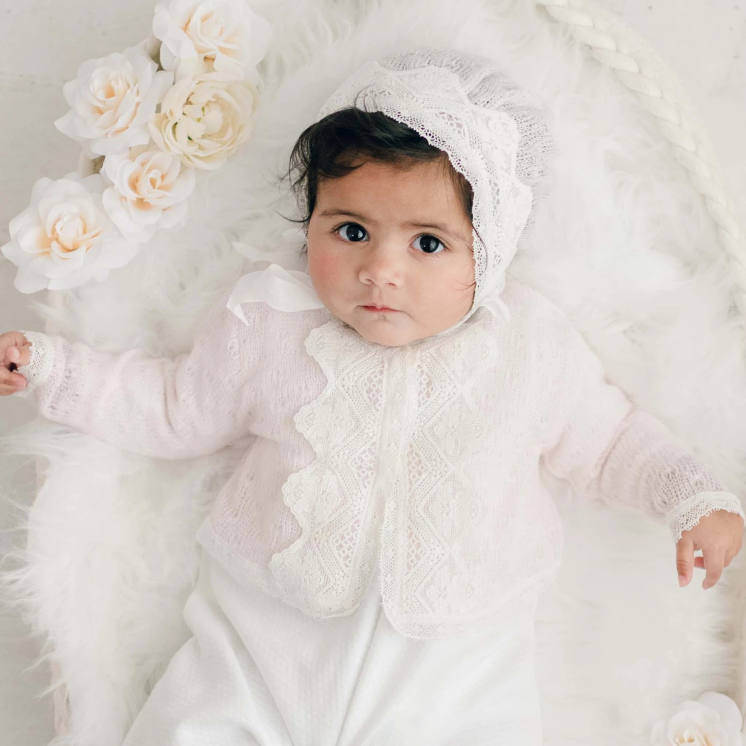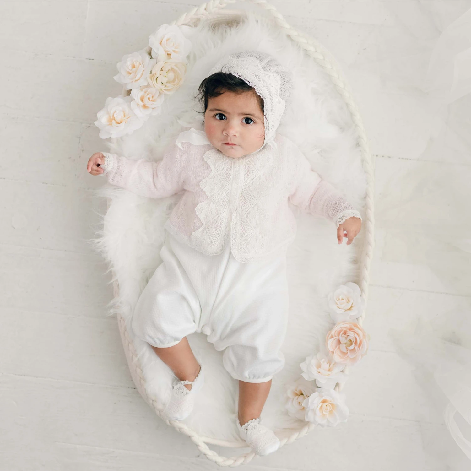 The Hailey Knit Sweater is a lovely addition to her Hailey romper! Made with our super soft knit in a gorgeous shade of pink and matching light ivory laces. Perfect for an extra layer with any outfit! Pair with the matching Hailey knit bonnet for a sweet and cozy set!