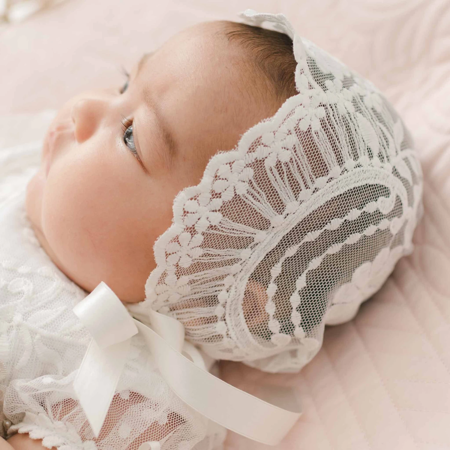 Made with the same intricately embroidered lace featured on the bodice of the the Harper dress and layette, the Harper bonnet provides a semi-sheer lace bonnet option for a delicate and formal look. Ivory silk ribbon ties allow for a comfortable and secure fit.