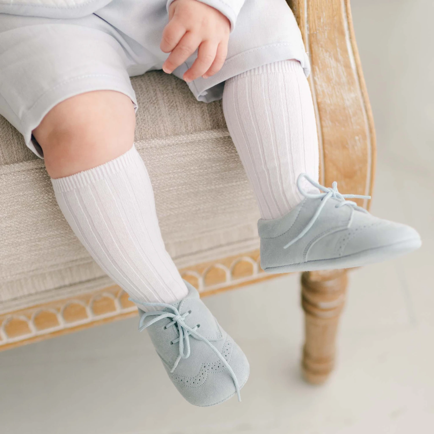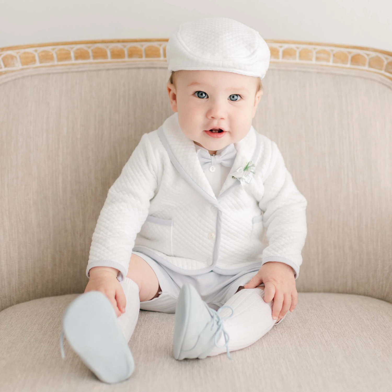 More than just baby boy dress clothes, the Harrison baby boy shorts suit is designed with your baby’s comfort in mind, while also keeping him classically styled. Made with plush white quilted cotton to keep him comfortable and light blue linen/cotton blend shorts. The jacket features a fold over collar and adorable functional pockets, and the light blue linen trim adds a boyish charm. The light blue shorts include a back pocket and summarys add detail to this cute baby boy outfit. Add the matching Newsboy Cap and Harrison booties to complete his baby boy 3-piece suit from head to toe. A perfect baby boy wedding outfit, or 3-piece suit for first birthday, baptism, christening or blessing.
