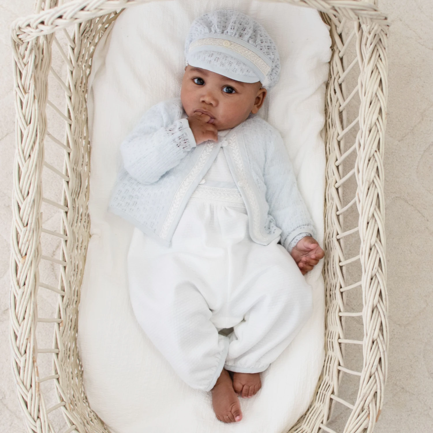 So sweet and classic! The Harrison romper is our customer favorite when looking for a classic coming home outfit that is comfortable and distinctive. The romper features ivory Venice lace and a blue cotton/linen edging that adds detail not usually found in baby boy clothes. It will surely set him apart for his special day! The textured white cotton is soft to keep him comfortable throughout the day. The hidden snaps at the legs and summarys at shoulders allow for ease getting him into his beautiful baby outfit. Made to fall about ankle length depending on his height. Darling baby attire for a wedding, baptism suit, or any special occasion. Don’t forget to add his knit sweater, hat, and booties for a complete heirloom outfit he can pass down to his own little one someday!