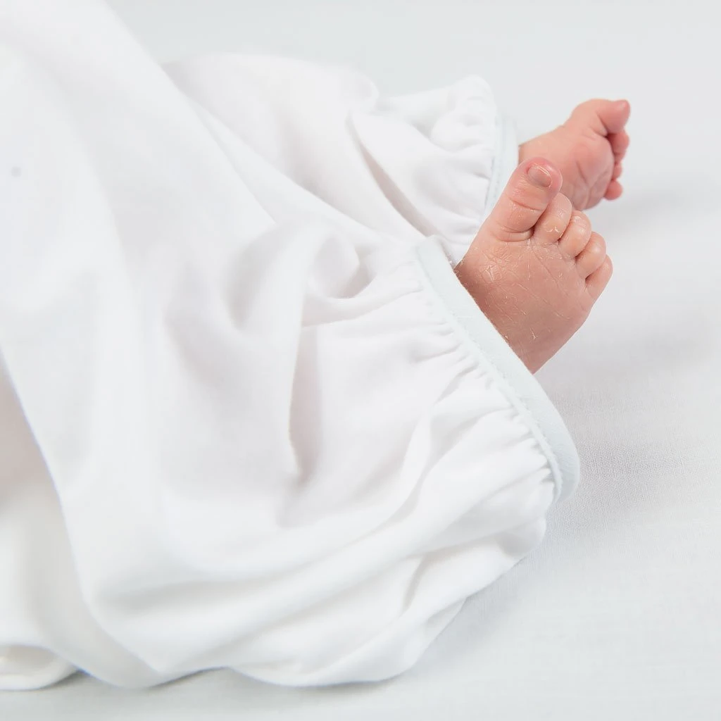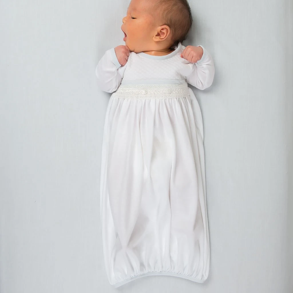 When looking for a newborn coming home gown for boys, comfort and style are essential. The Harrison newborn gown is made with soft pima cotton in white, and features a plush white quilt bodice that was selected with baby’s comfort in mind. The ivory Venice lace accent along the bodice adds a subtle special detail that is not found in most newborn baby boys outfits. Light blue linen trim adds the perfect princely touch. This classic baby gown is as stylish as it is functional-the open skirt design keeps baby covered while also allowing easy diaper changes. It also makes this a perfect bris outfit. Add his newborn baby booties or trendy hat for a complete outfit that is as sweet as he is.