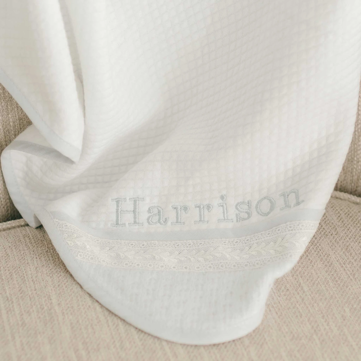 Wrap him up in the best. Our Harrison blanket is made with a plush quilted white cotton to keep him cozy and warm, and is trimmed with light blue linen. The accent corner features our Harrison ivory Venice lace adding a touch of elegance. You have the option to have his name embroidered in light blue thread on the accent corner, making this a personalized baby blanket that he will cherish for years. This makes a sweet baby shower gift, but can also be used to keep him warm and styled on a special occasion such as coming home from the hospital or for use during a baptism.