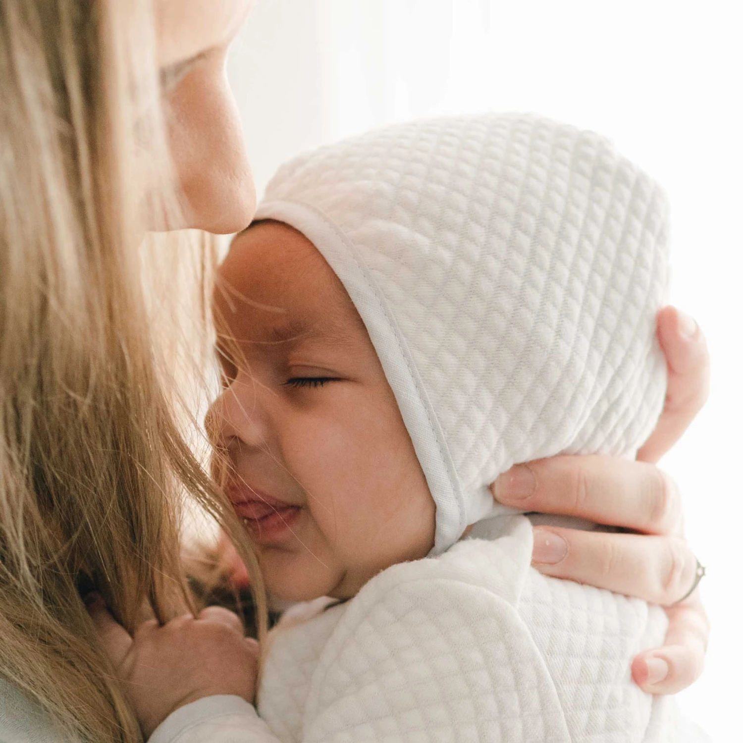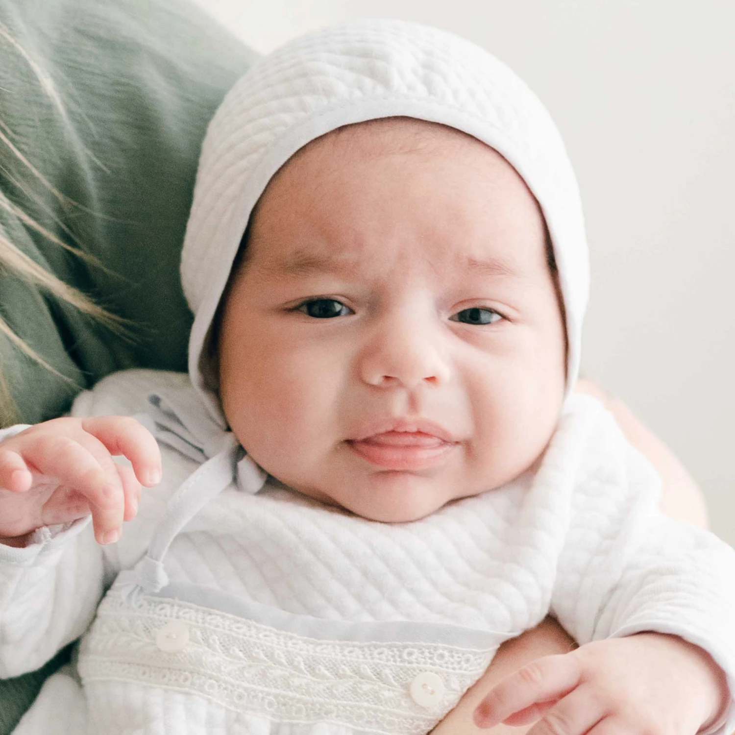 This vintage inspired boys baby bonnet is the perfect finishing touch to his take home outfit. Made with our soft quilted cotton in white, it is trimmed in light blue linen so it matches his Harrison newborn gown, yet is simply styled for any coming home outfit. Blue linen ties under the chin allow for a comfortable fit. An adorable traditional baby bonnet to keep your newborn baby warm and styled.