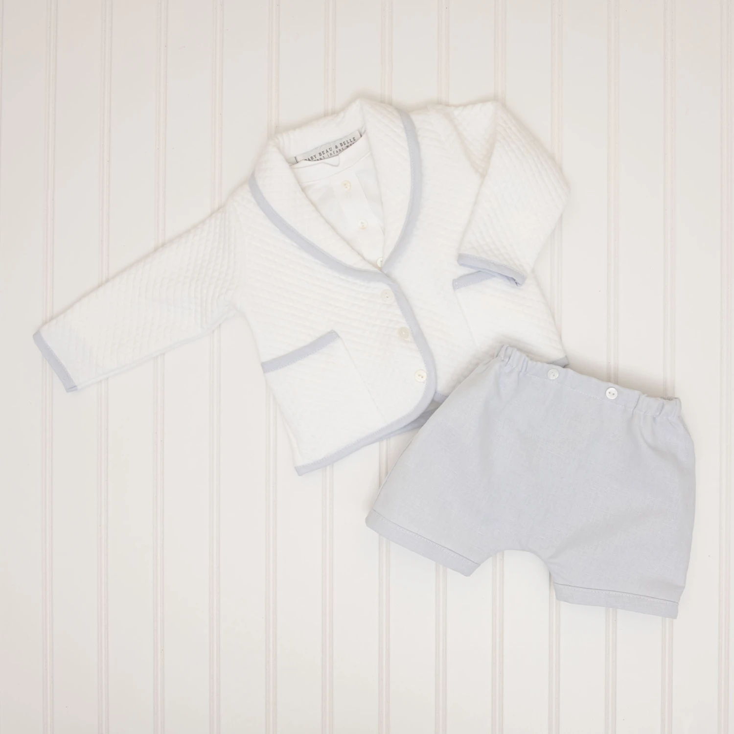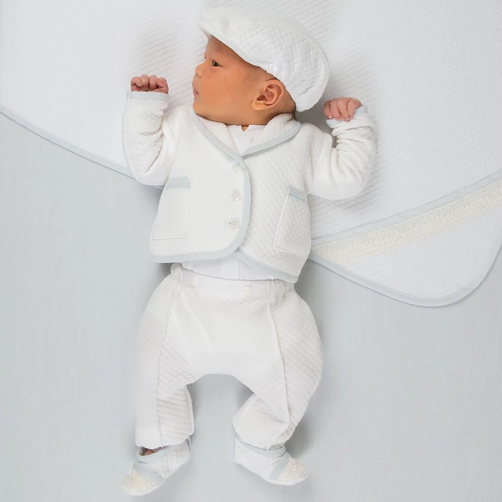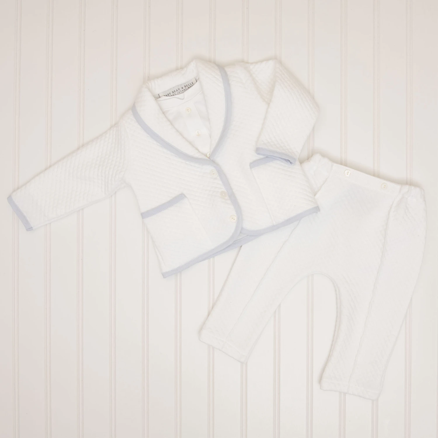 Our Harrison baby boy suit was such a customer favorite, we specially created this designer outfit for your newest little one. Made with plush white quilted cotton and soft blue linen edging, this suit has special details not found in most newborn outfits. The folded collar and functional little pockets on the jacket are darling, and the pleated front creases on the pants make him look like a stylish little gentleman. Pair with the matching newsboy hat and newborn booties to complete his look. Whether used for coming home from the hospital, baby’s first pictures, or as a baptism outfit, the Harrison baby outfit is perfect for your special occasion.