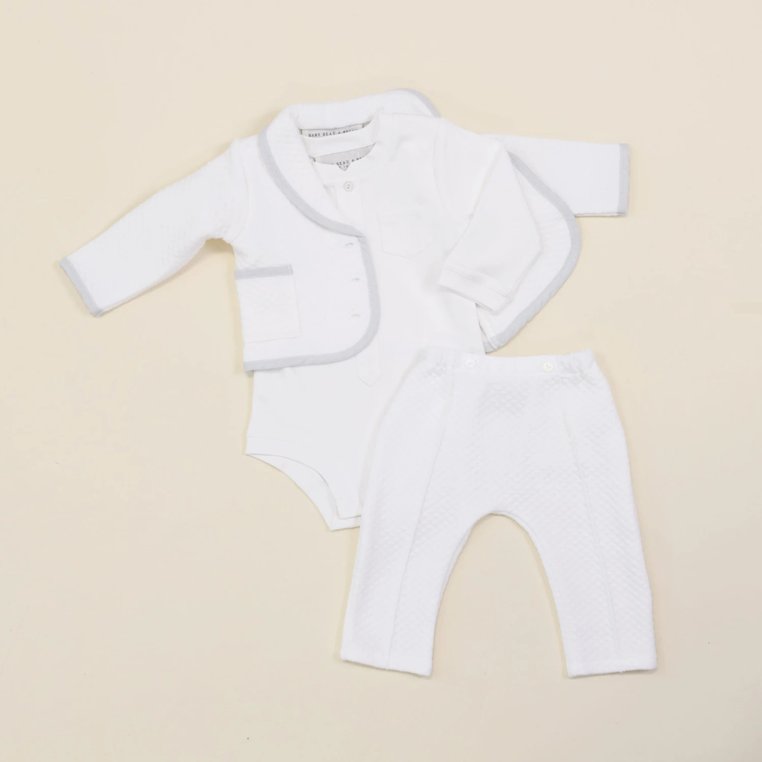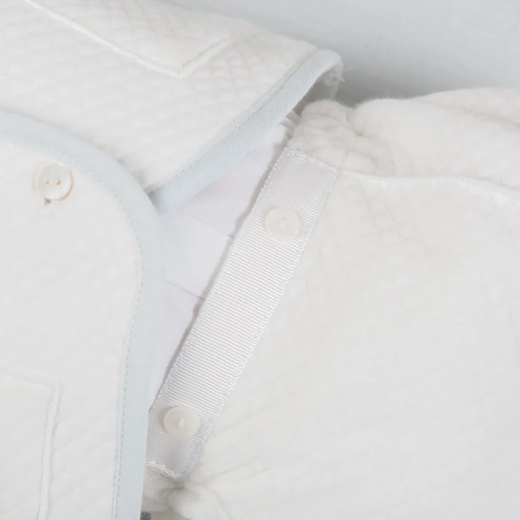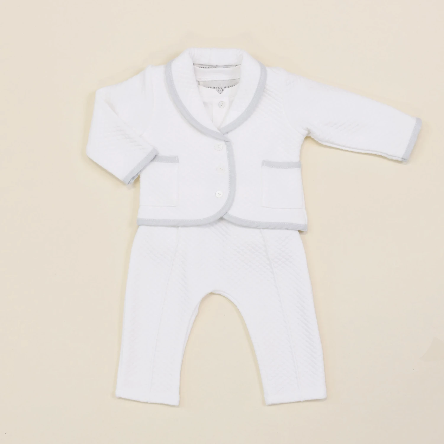 Our Harrison baby boy suit was such a customer favorite, we specially created this designer outfit for your newest little one. Made with plush white quilted cotton and soft blue linen edging, this suit has special details not found in most newborn outfits. The folded collar and functional little pockets on the jacket are darling, and the pleated front creases on the pants make him look like a stylish little gentleman. Pair with the matching newsboy hat and newborn booties to complete his look. Whether used for coming home from the hospital, baby’s first pictures, or as a baptism outfit, the Harrison baby outfit is perfect for your special occasion.