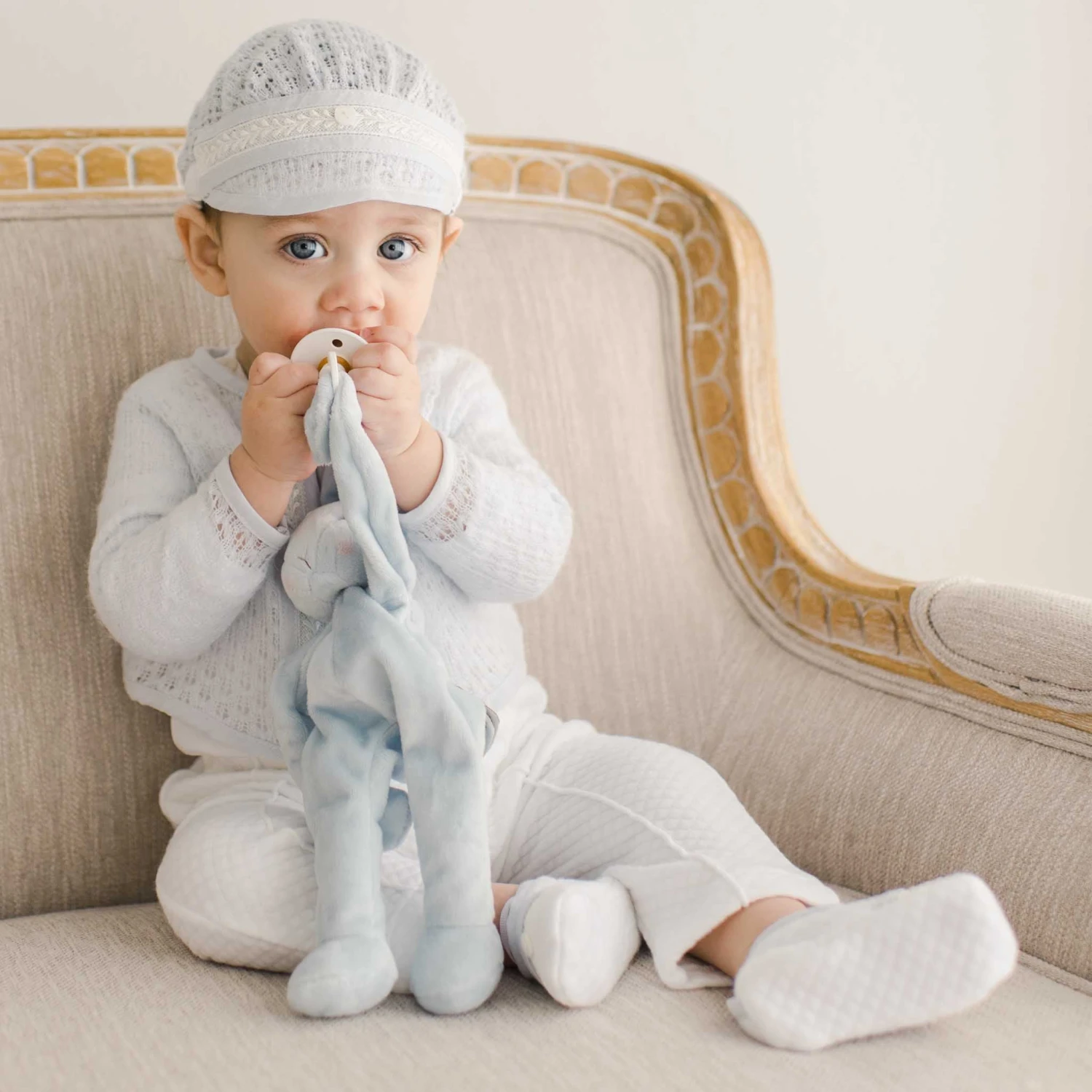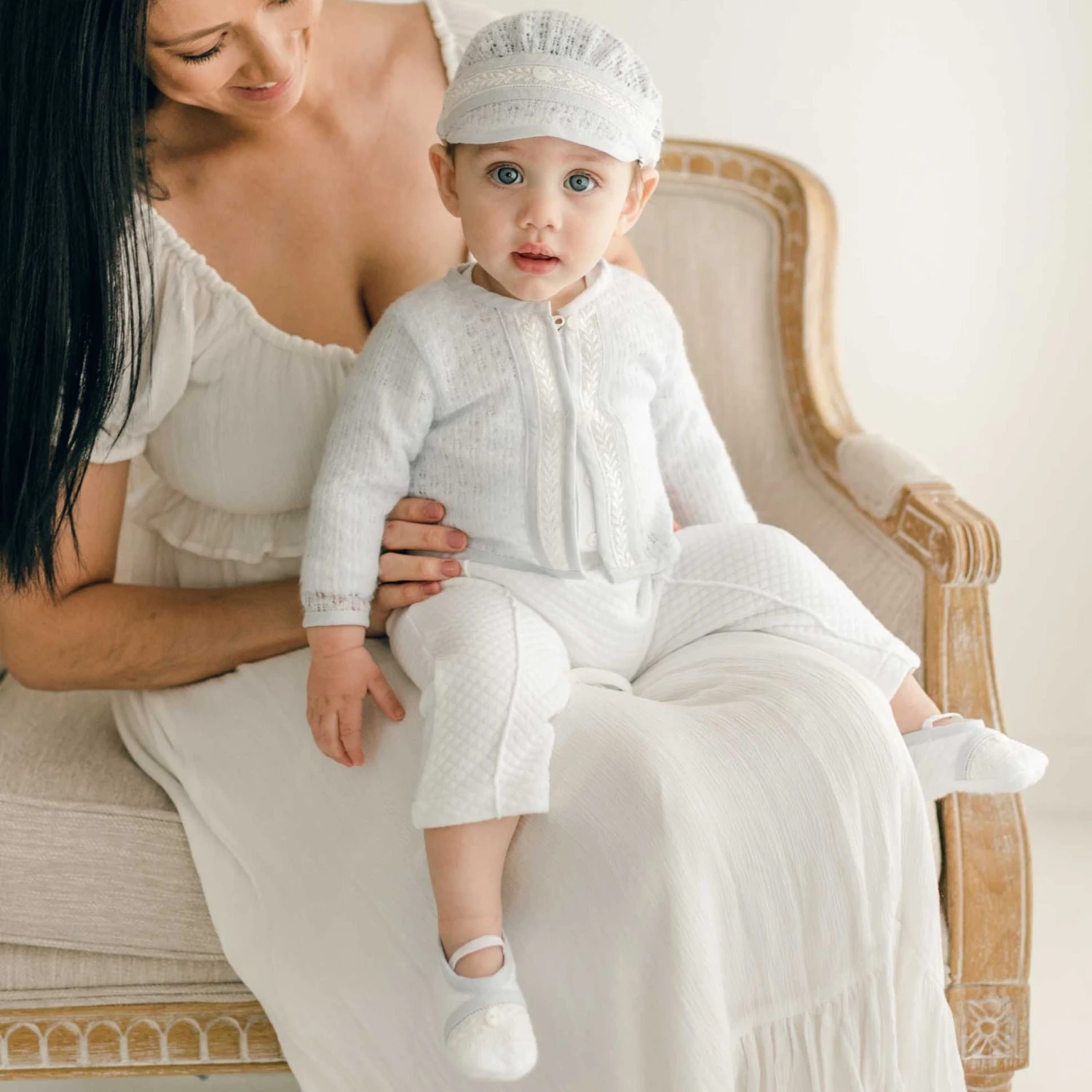 This adorable baby boy 3-piece suit is a beautiful option for his special day! The pants are designed with a textured 100% white cotton with an adorable pleated detail. A soft elastic waist creates an easy fit. The blue knit sweater is super soft and detailed with ivory lace and blue linen. The cotton/rayon blend shirt underneath is super soft, making this an outfit he will be comfortable in all day. The perfect baby boy wedding outfit or baby boy suit for special occasions such as baptism, christening, or first birthday pictures! Your dapper dude will look dashing in all those pix you’ll be snapping.
