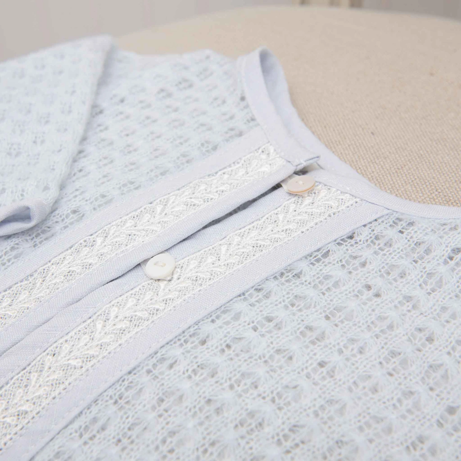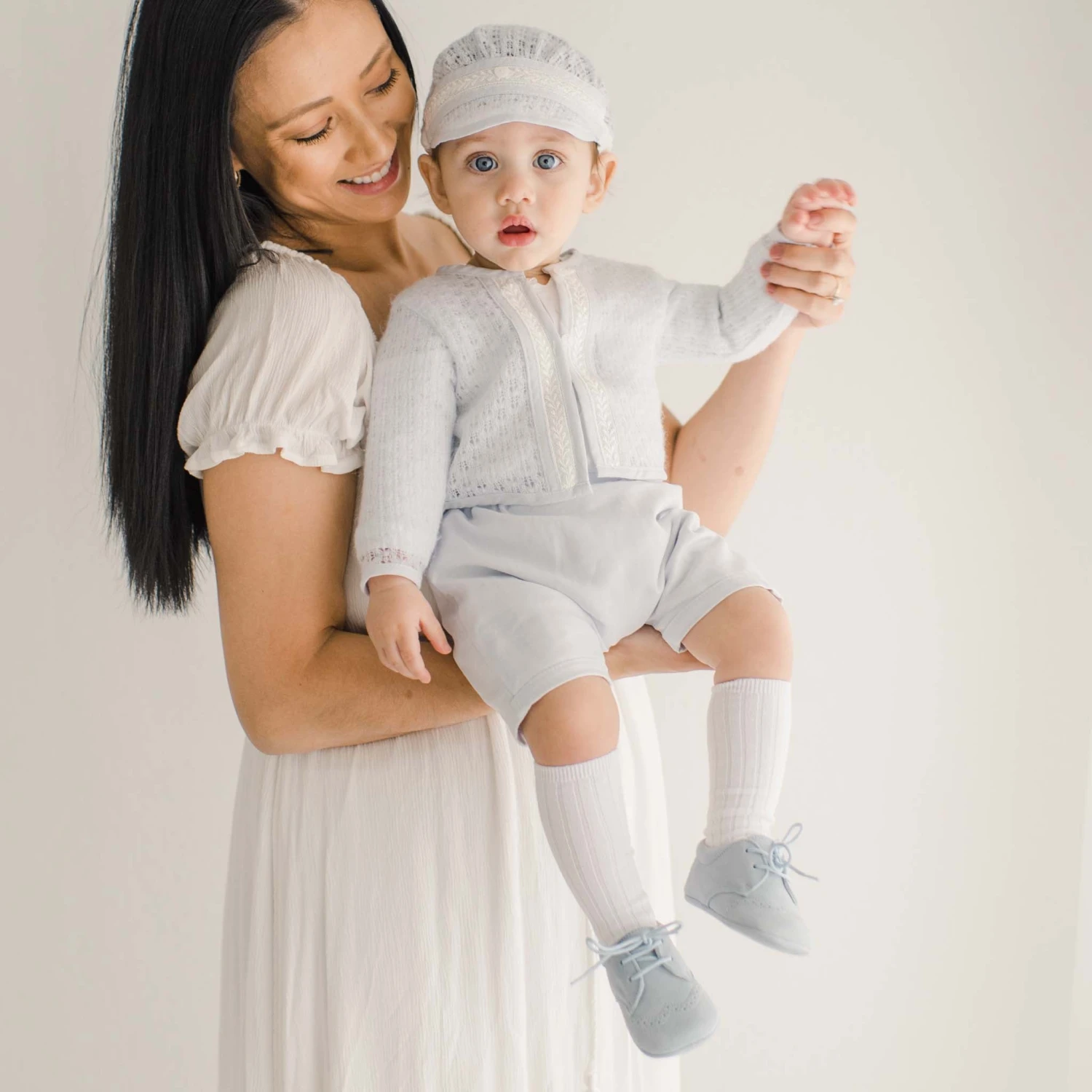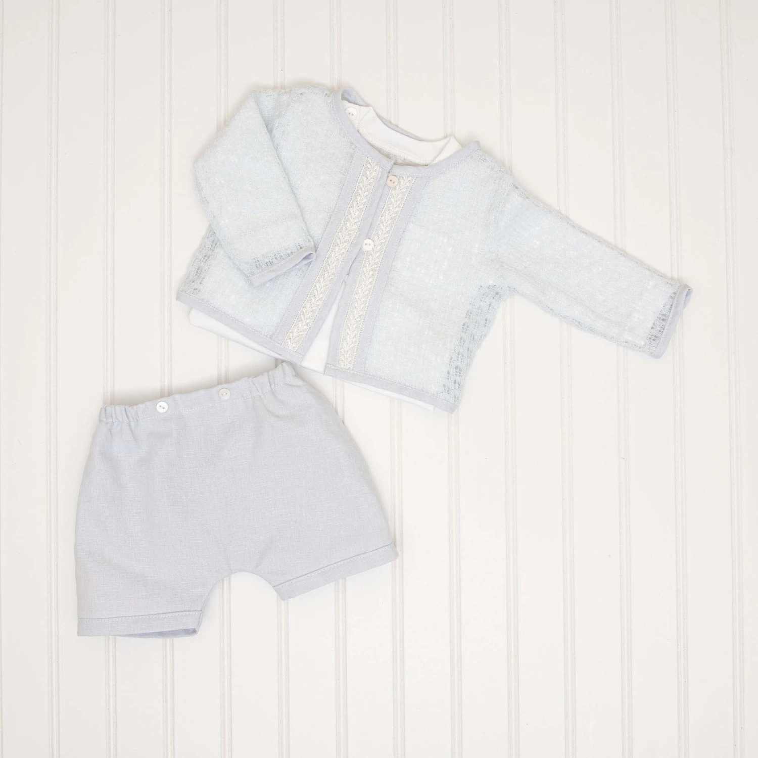 This adorable baby boy 3-piece shorts suit is a beautiful option for his special day! The shorts are designed with a natural ivory French terry cotton or blue linen blend with an adorable summary detail on the waist and cuffed hem. A soft elastic waist creates an easy fit. The blue knit sweater is super soft and detailed with ivory lace and blue linen. The cotton/rayon blend shirt underneath is super soft, making this an outfit he will be comfortable in all day. The perfect baby boy wedding outfit or baby boy suit for special occasions such as baptism, christening, or first birthday pictures! Your dapper dude will look dashing in all those pix you’ll be snapping.