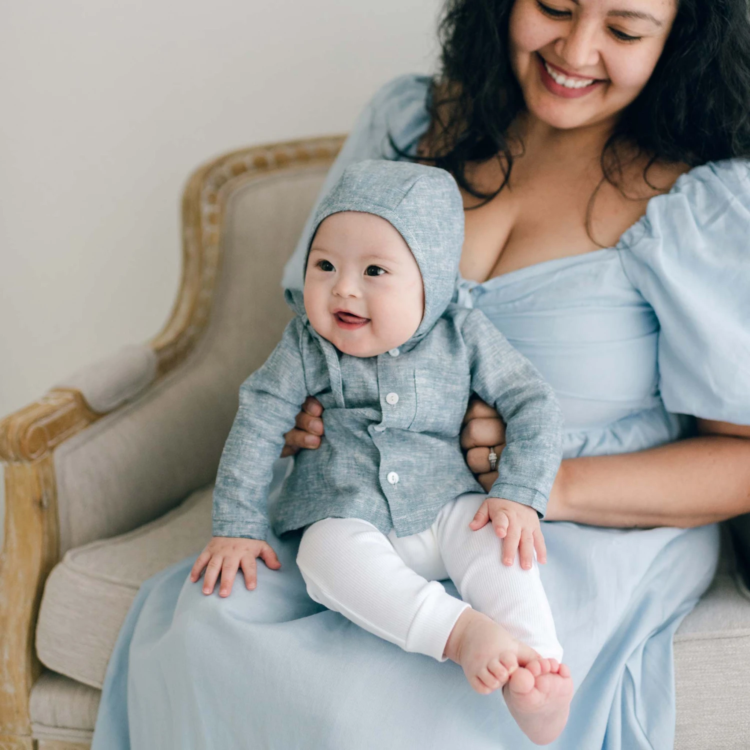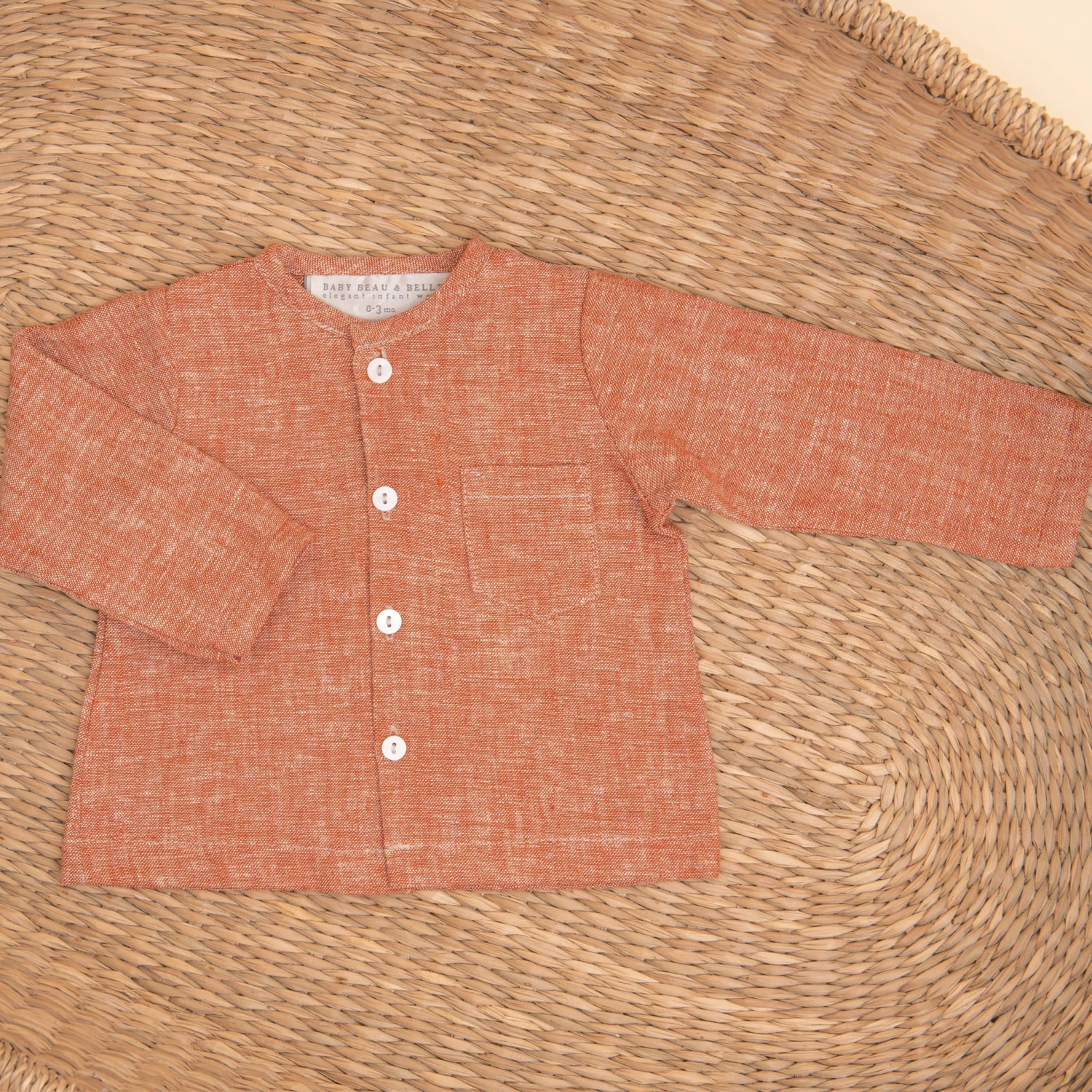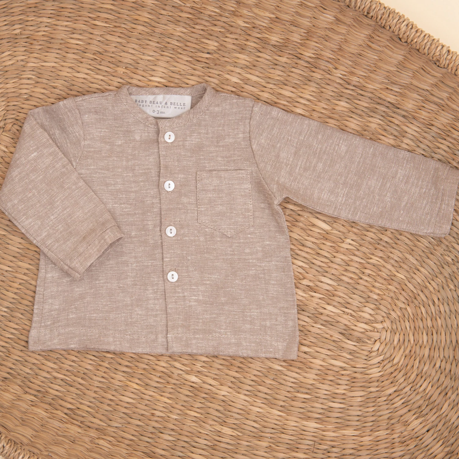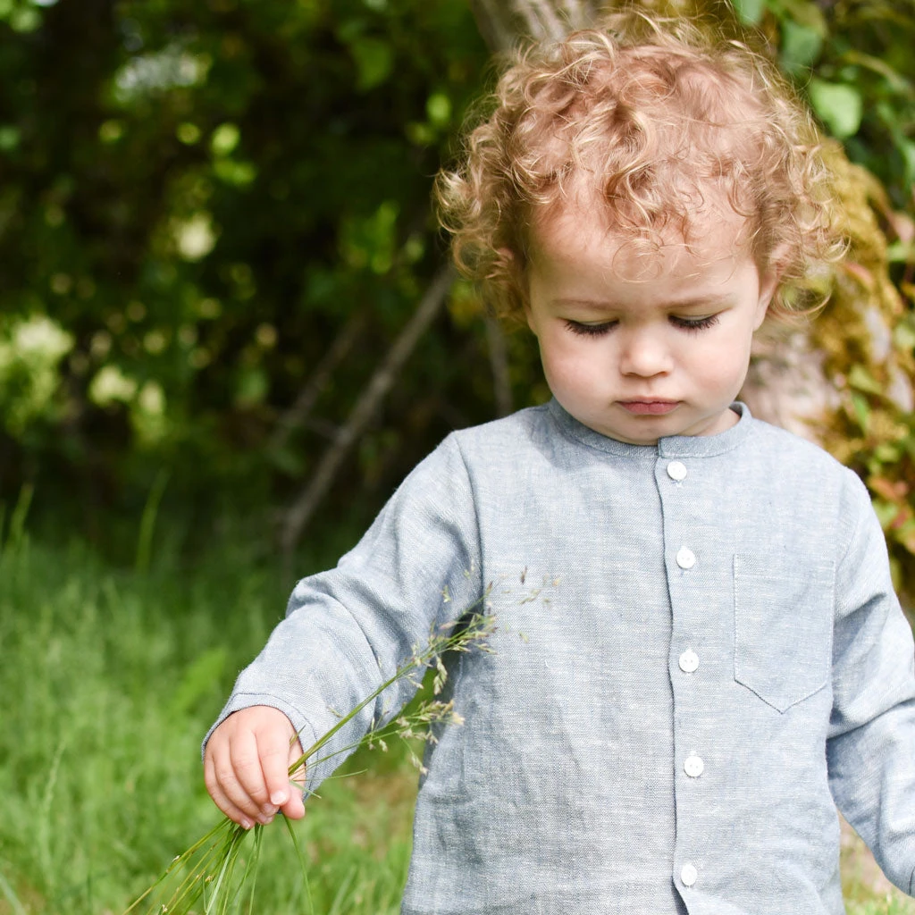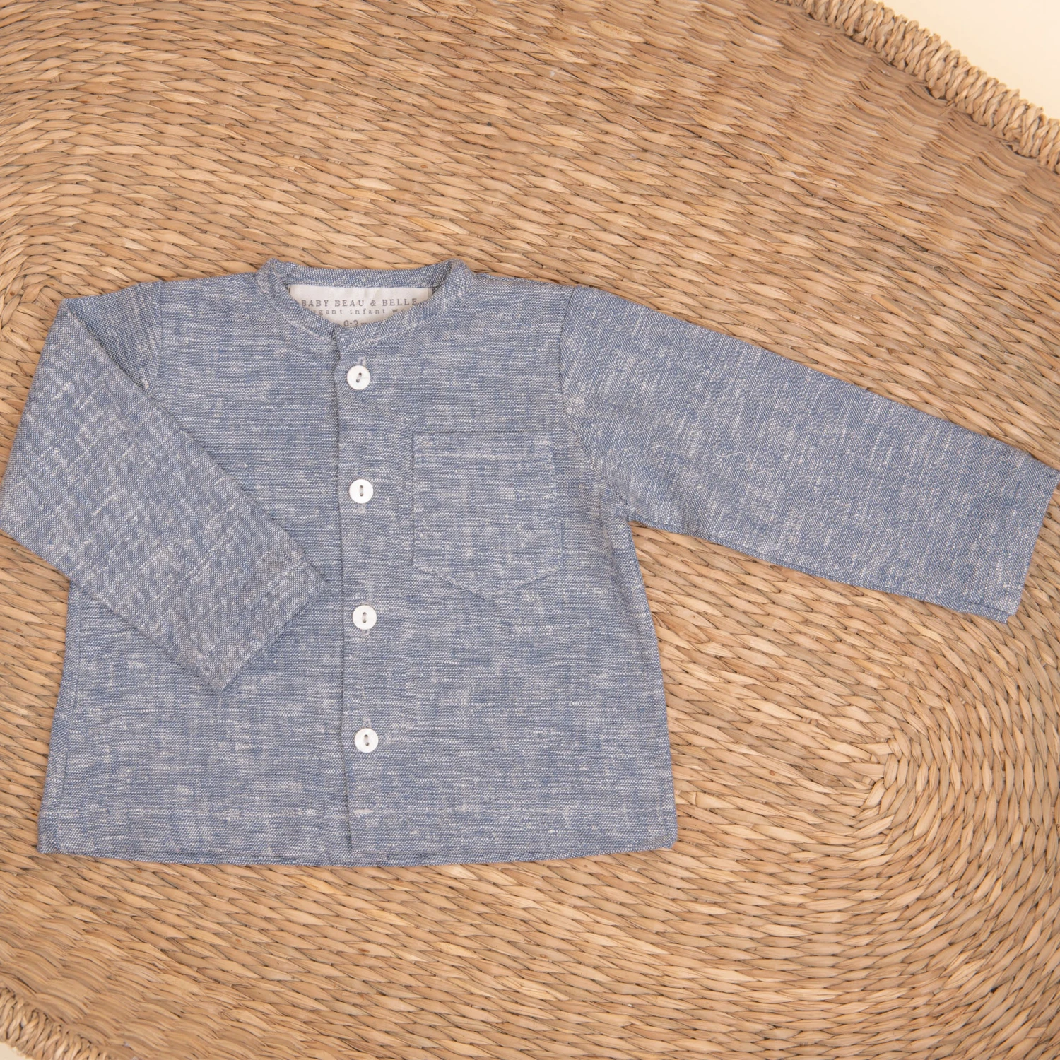 A perfect layer for any occasion and any season! This collarless shirt is made in a soft linen/cotton blend to keep baby comfortable and looking his best, can easily be layered over a t-shirt or worn on its own. A sweet chest pocket detail is the perfect finishing touch!