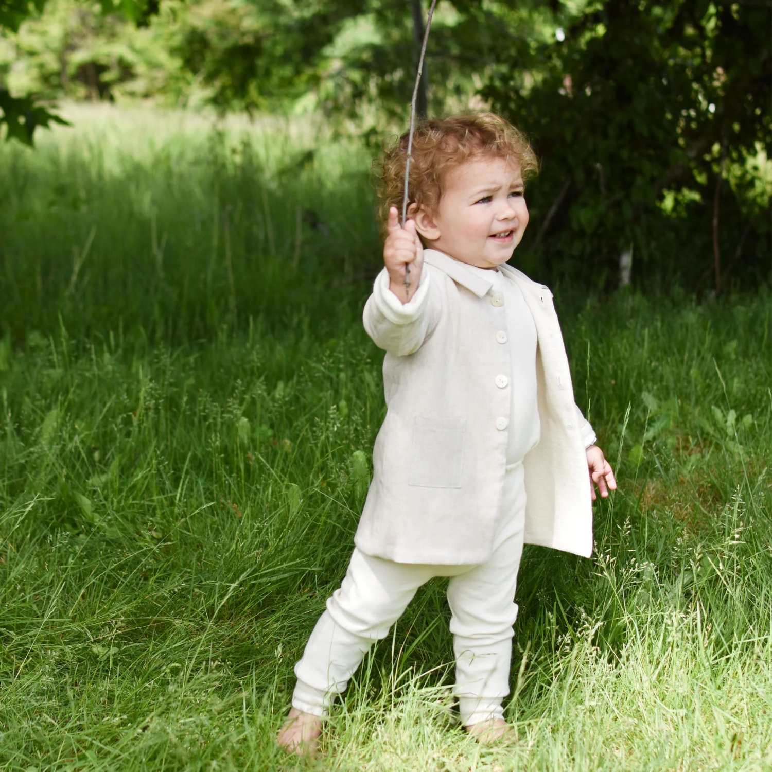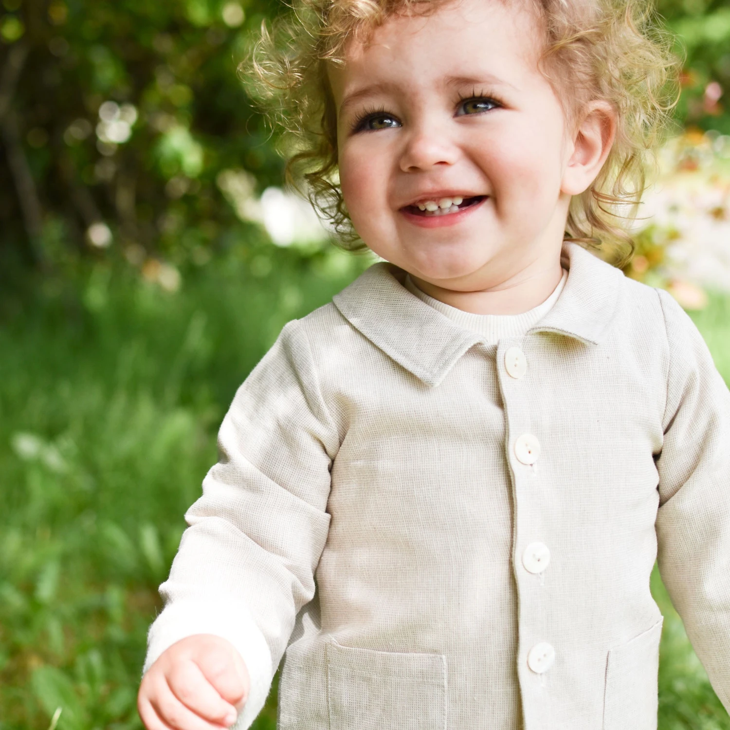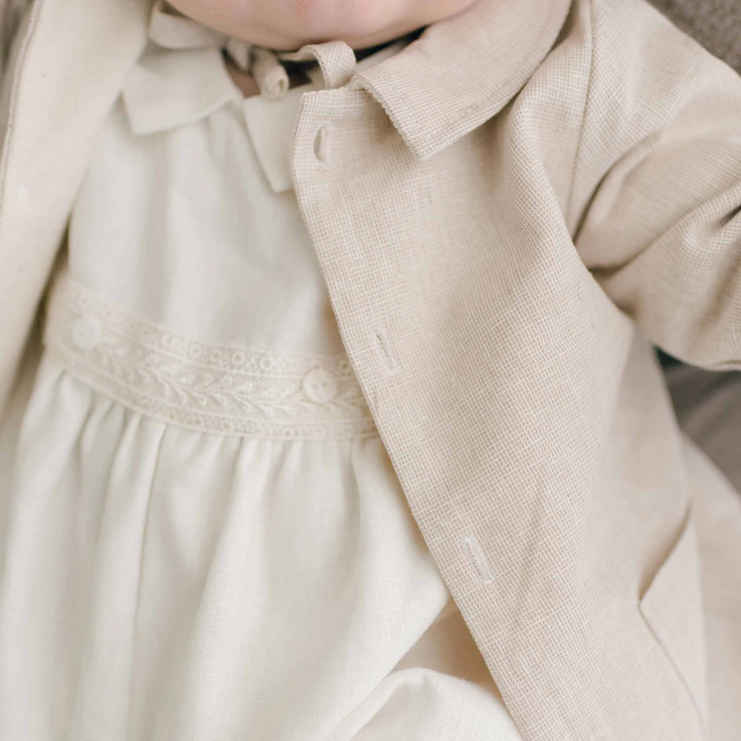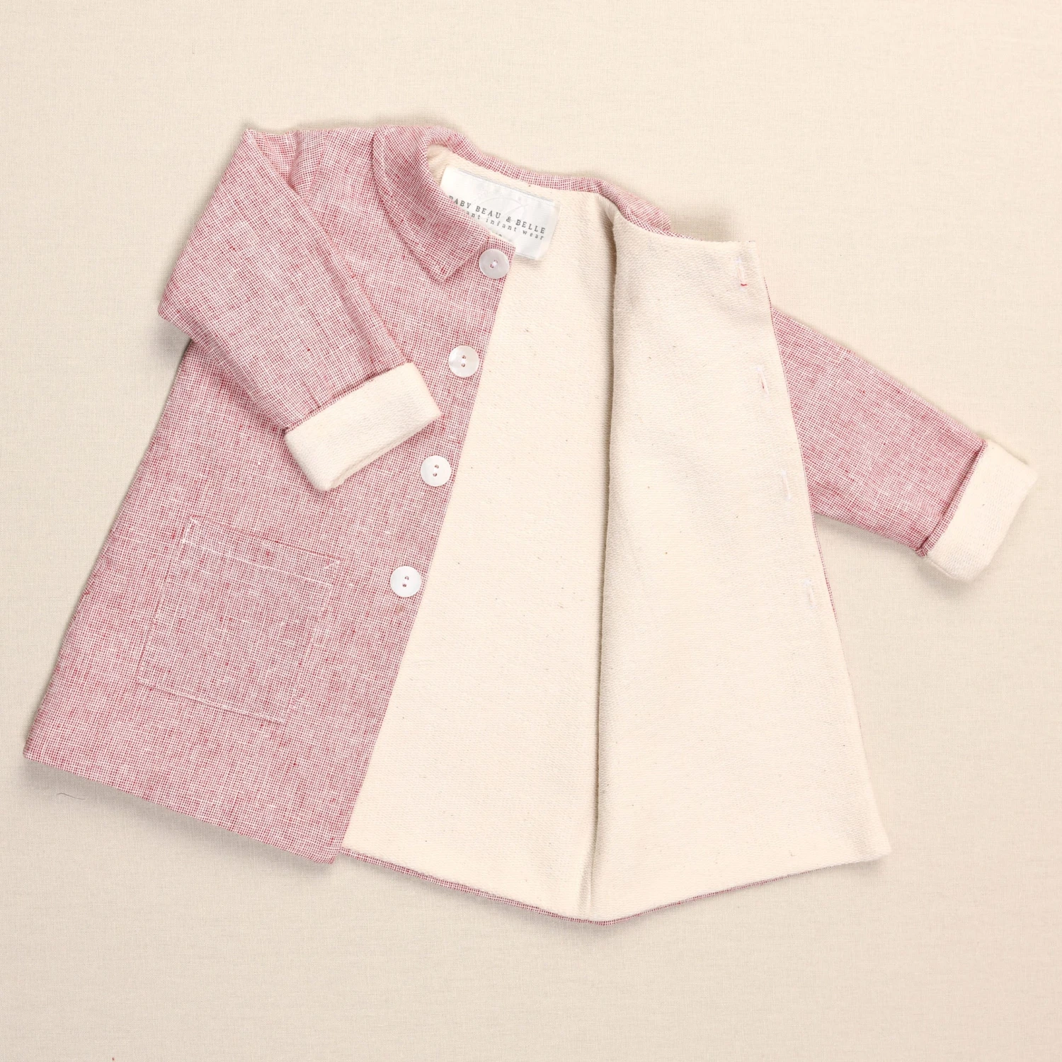 A delightful coat to layer over any outfit! The linen and french terry cotton trench coat features wide summarys and a darling collar for little details to finish his outfit to perfection. The sleeves are designed to be long so they can be cuffed and make a custom fit for your little one. The fit is to fall near his mid-thigh so he can still move around easily.