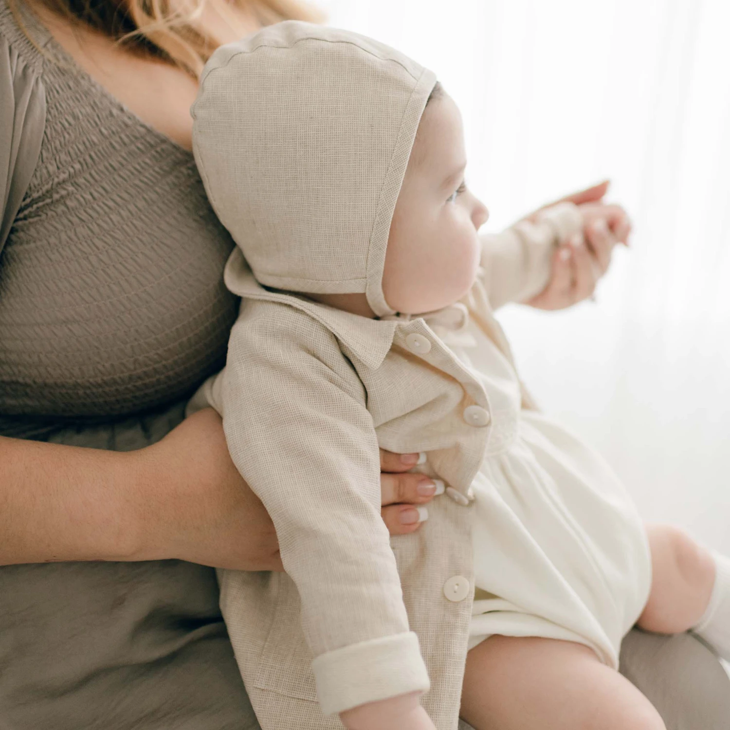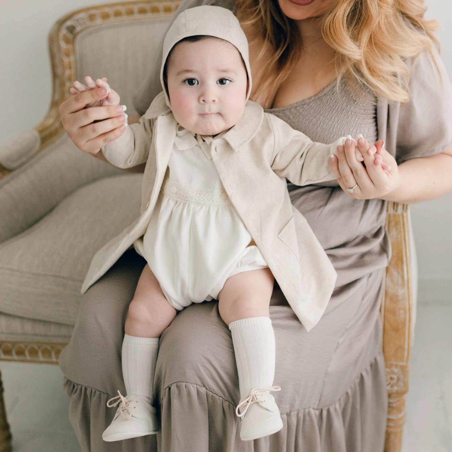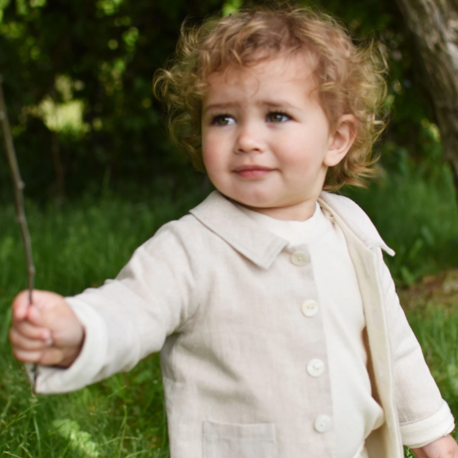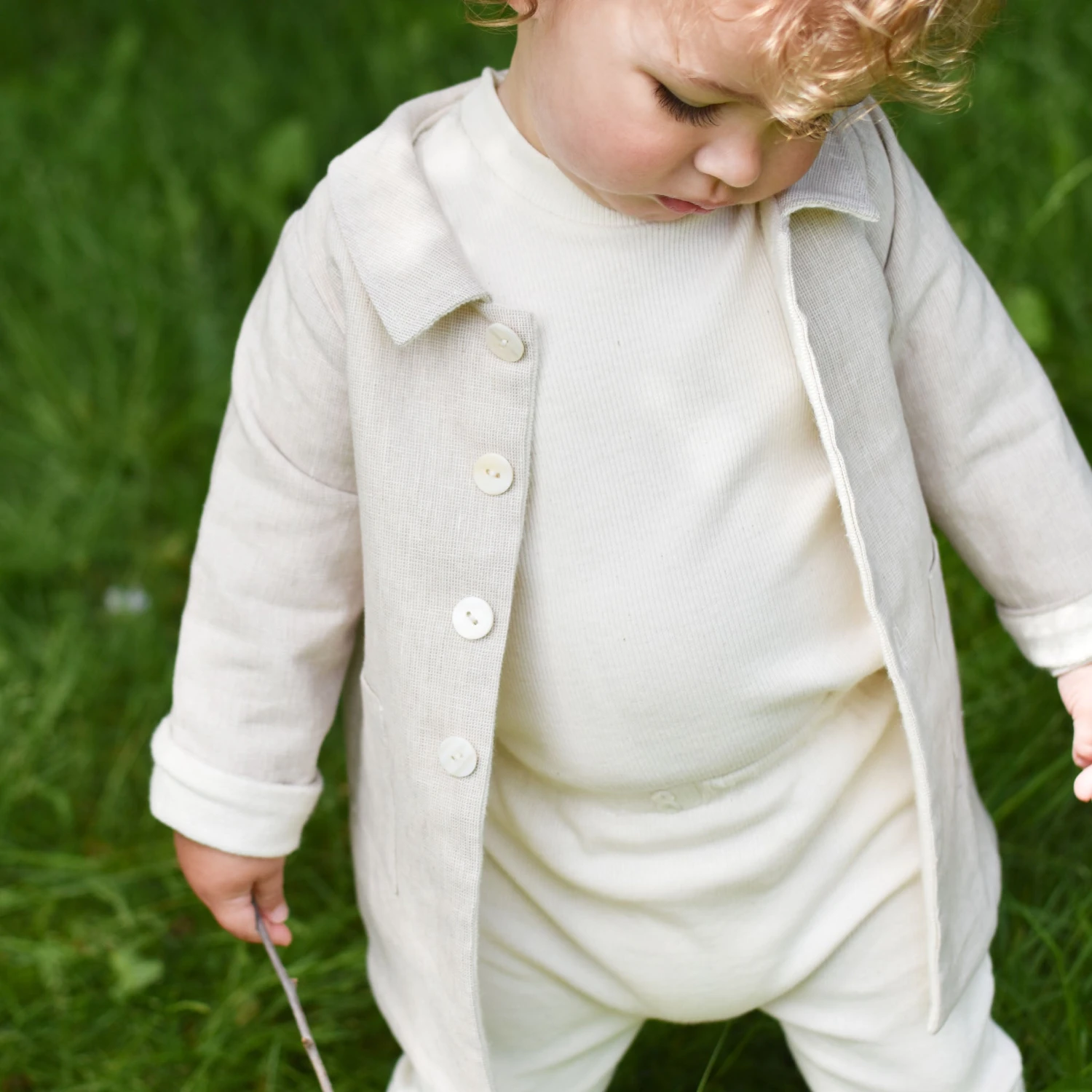 A delightful coat to layer over any outfit! The linen and french terry cotton trench coat features wide summarys and a darling collar for little details to finish his outfit to perfection. The sleeves are designed to be long so they can be cuffed and make a custom fit for your little one. The fit is to fall near his mid-thigh so he can still move around easily.