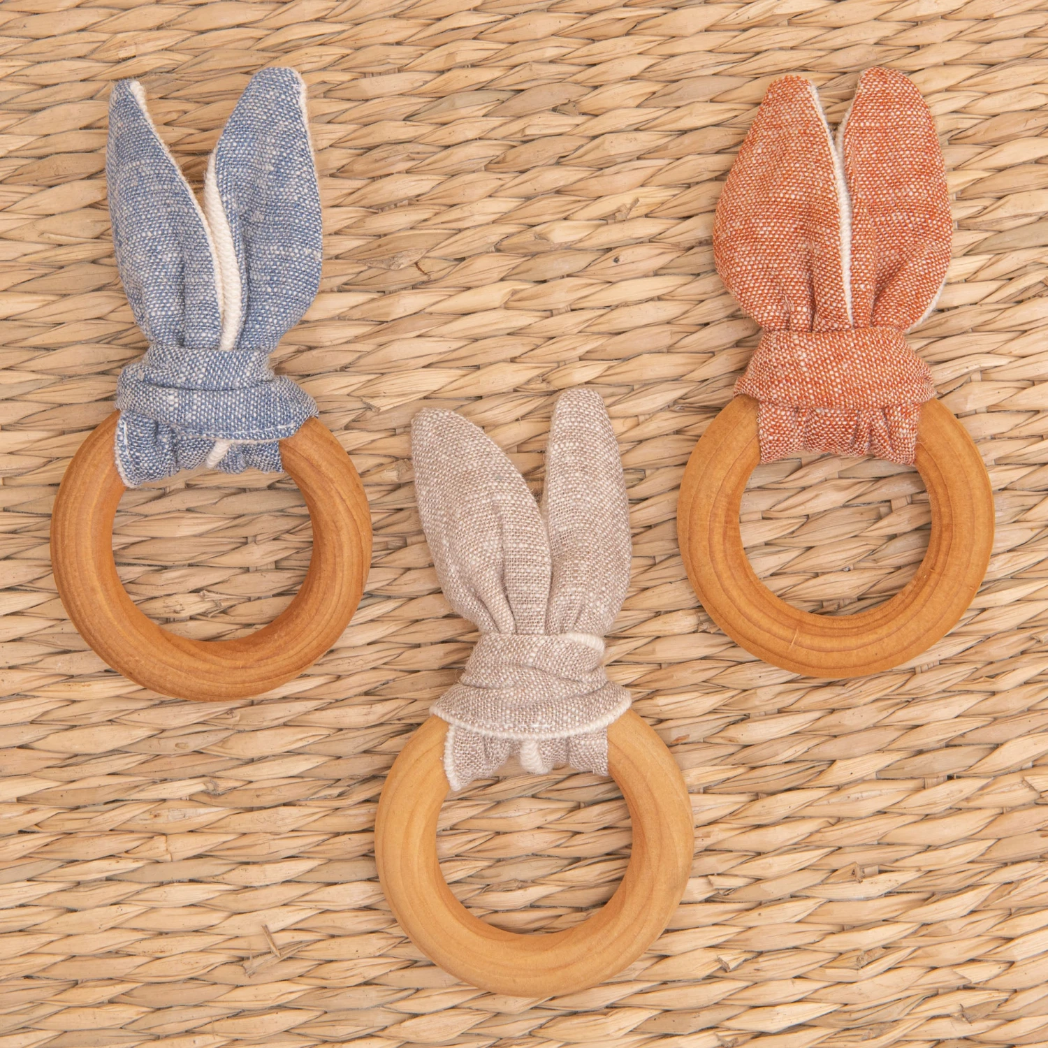 Perfect to keep a teething little one entertained! Made with organic Maple wood and hand-sanded and hand-polished with beeswax and olive oil to keep the wood perfectly conditioned and ready for your little one! Featuring a linen and French terry tie to help baby keep a grip on the ring while in use, perfect to coordinate with any outfit!