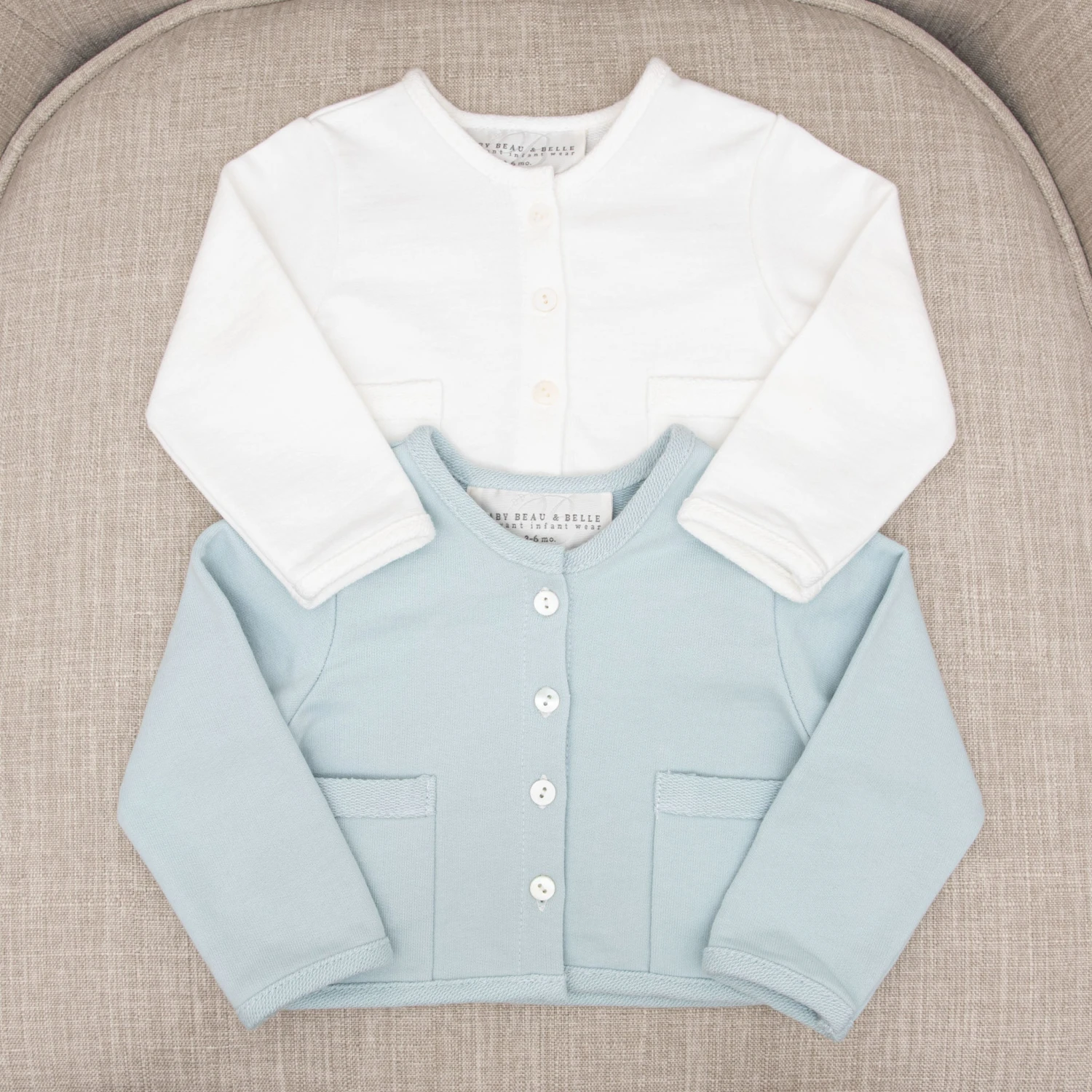 The perfect extra layer for his Ian outfit! Made with our soft French terry cotton in a sweet cardigan style that was designed to accent the adorable collar detail of the bodysuit.