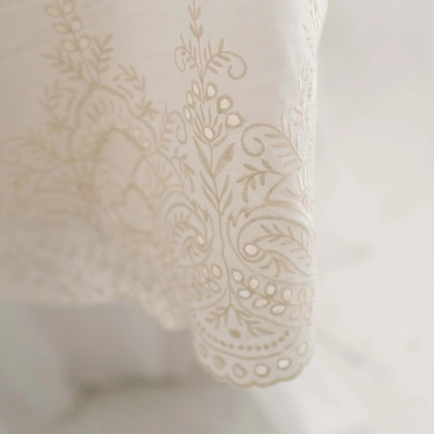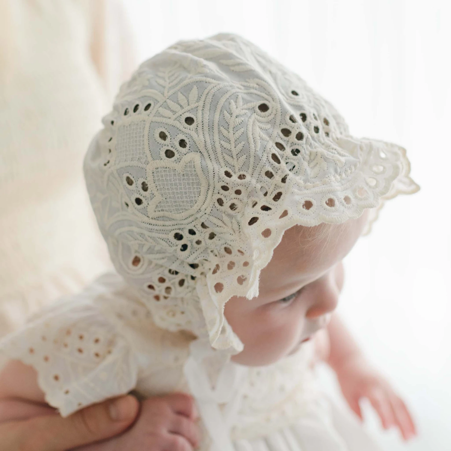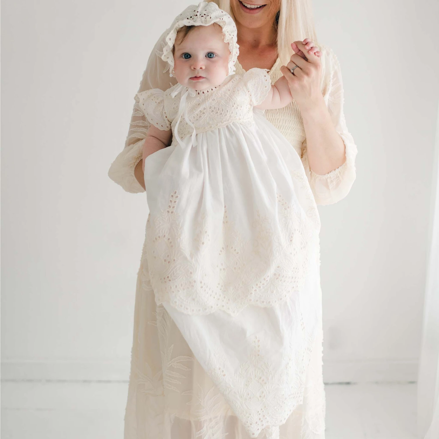 A sweet cotton gown that was meant for a beautiful Summer day! The Ingrid Blessing Gown is handcrafted with a lightweight 100% cotton in light ivory with an elegant tiered skirt for a luxe style. Natural embroidery in beautifully unique patterns are featured on the bodice, skirt hem and used to make cap sleeves. A soft natural lace in a scallop pattern trims the neckline. A connected sash, made with a very fine cotton ribbon in a complimentary light ivory color, ties for a lovely finish and custom fit. This Girls Gown is designed to fall past her toes. Closes in back with summarys. . Includes the beautiful matching embroidered lace Ingrid bonnet to complete here look. A lovely option for a Girls Baby Blessing or Christening.