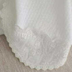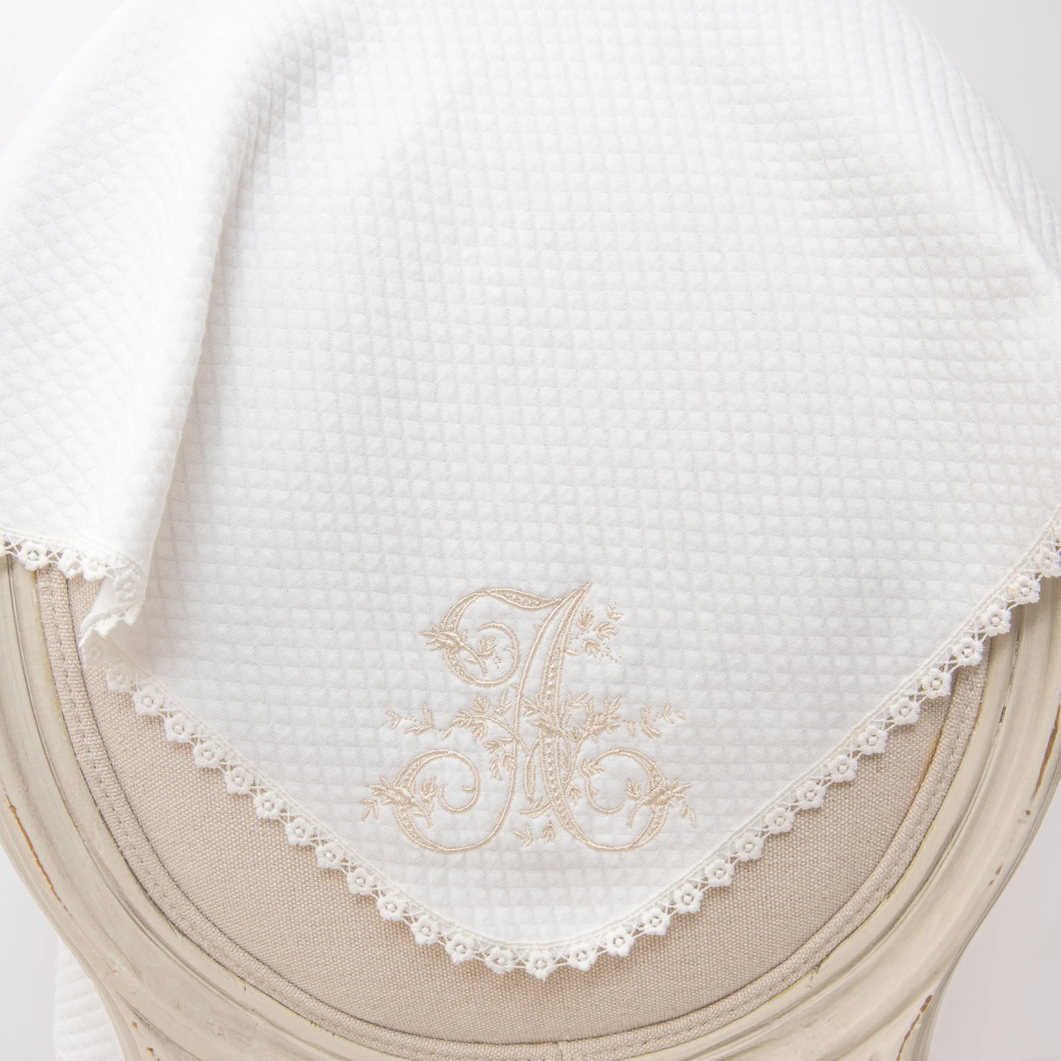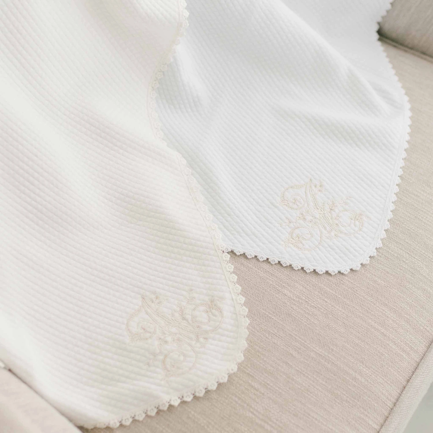 Our Initial Baby Blanket is hand crafted with 100% quilted cotton, a wonderful material known for its super soft texture and heirloom quality. Embroidered with baby’s initial in our signature letter embroidery in champagne thread for a personal touch that adds to the beauty of the design. Edges are adorned with a sweet lace that is also 100% cotton for an overall very soft blanket.