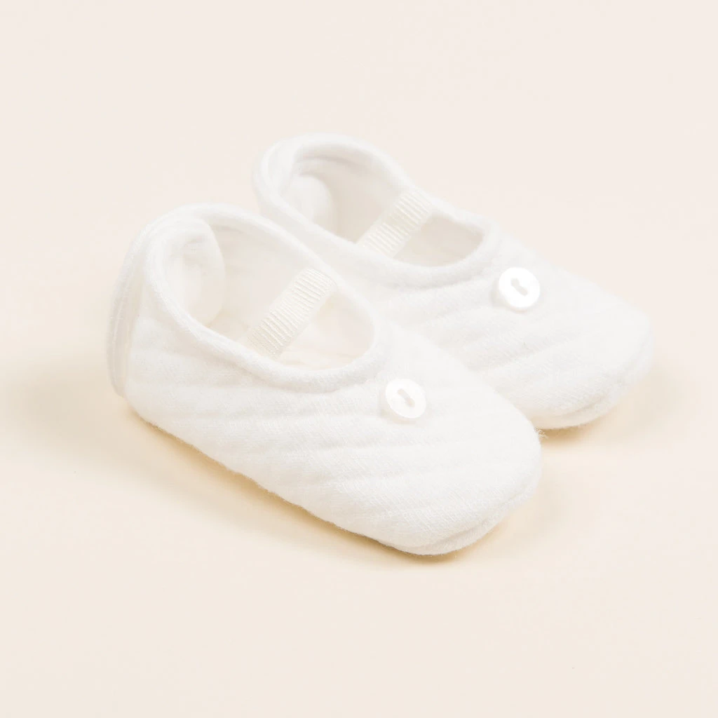 The perfect booties to coordinate with any outfit! Made with our classic quilted textured cotton in our lovely fresh cream ivory tone and a soft stretch strap will help to keep the booties on baby’s foot. A true basic piece that will coordinate with many outfits and are perfect for everyday wear!