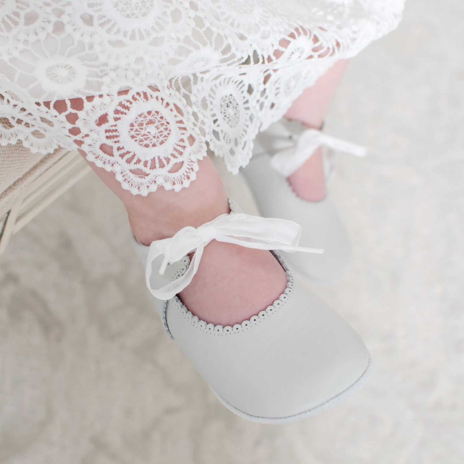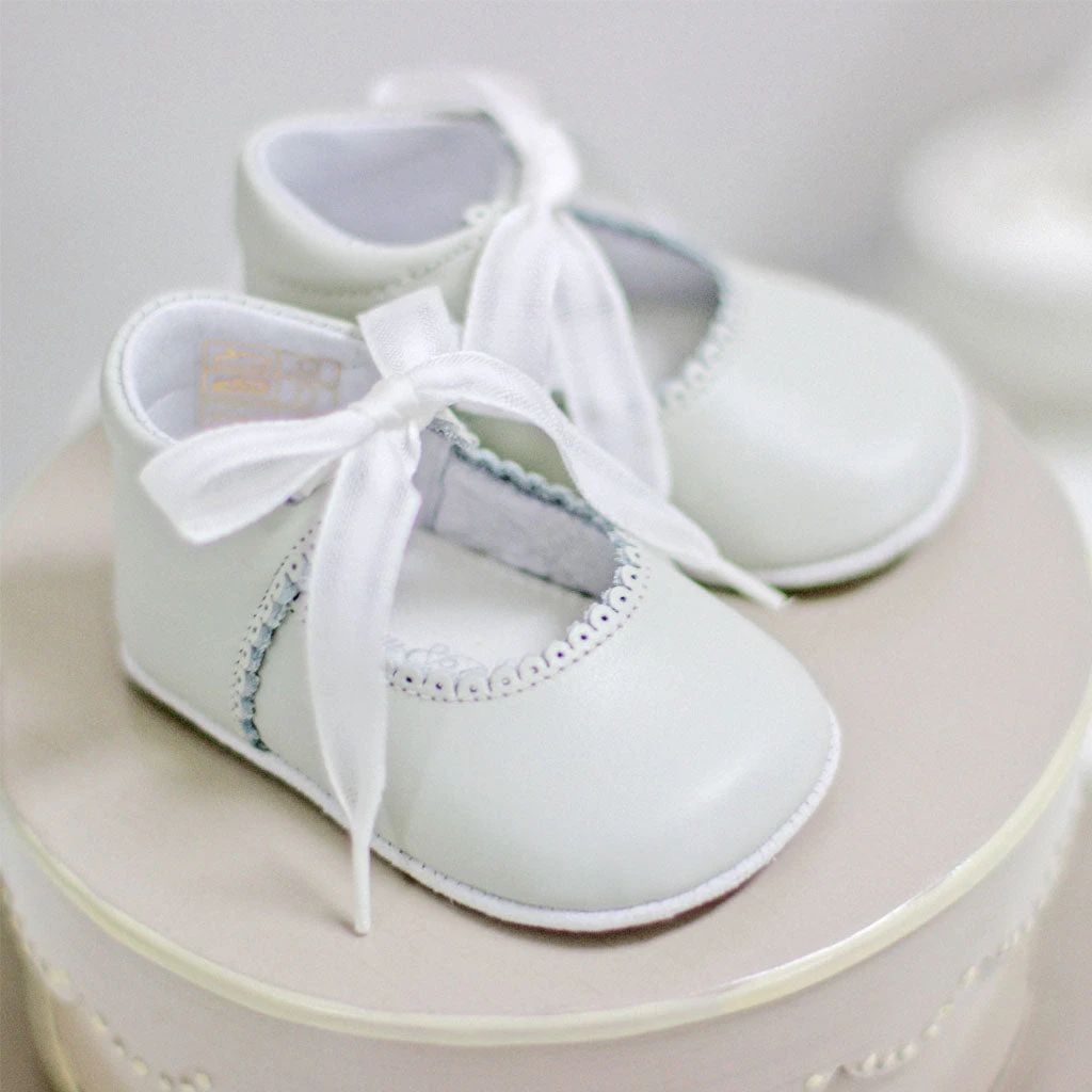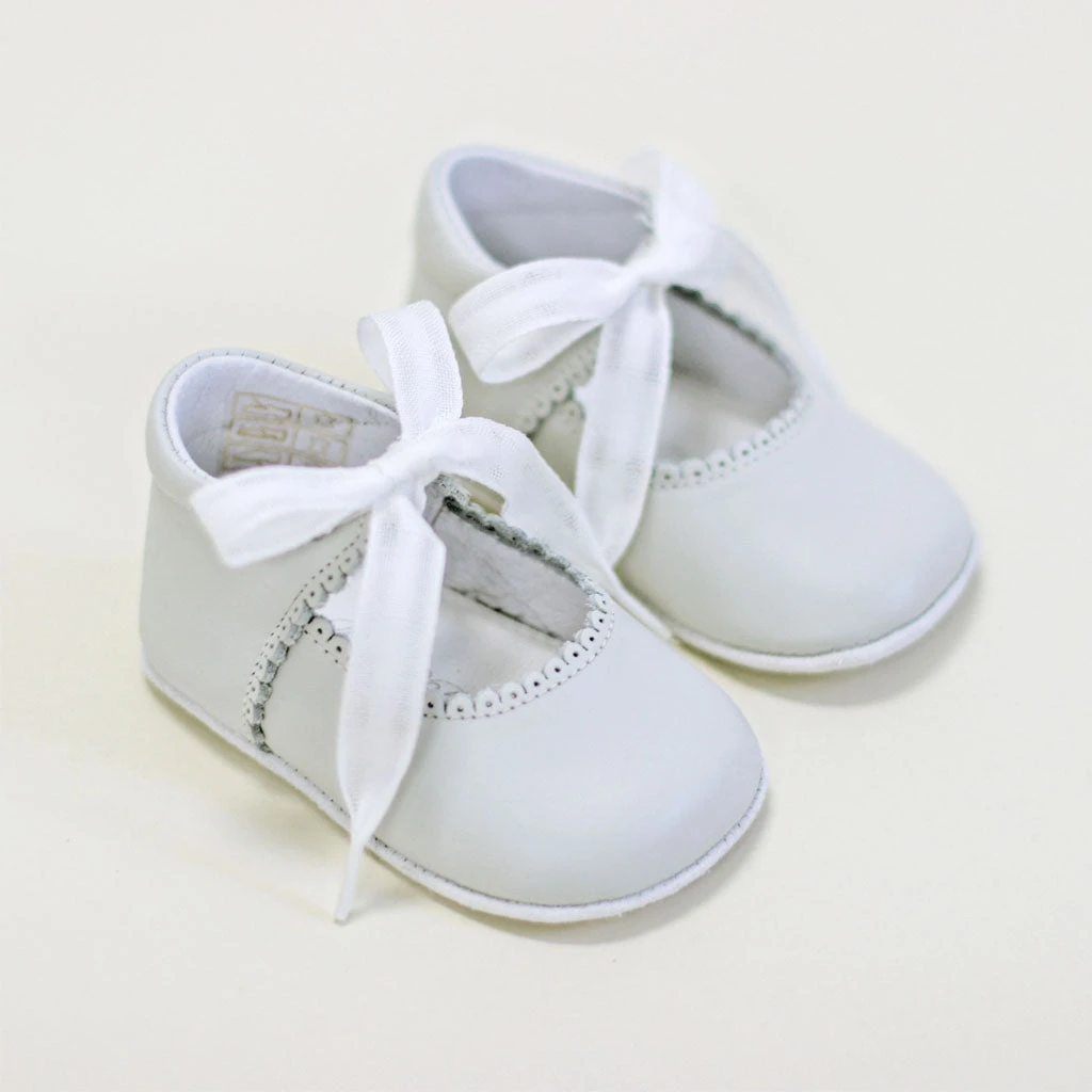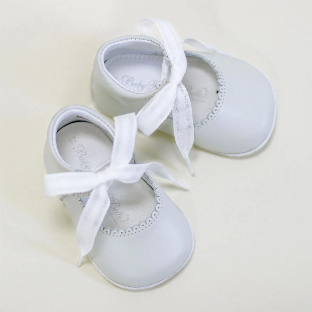 The Baby Beau & Belle Ivory Tie Mary Janes complete her outfit! These shoes are hand made for Baby Beau & Belle. They are made with ivory matte leather with beautiful scallop edge detail and coordinating cotton ribbon tie for an easy and comfortable fit. They also come in a variety of colors so you can match to any of our collections for that extra touch. Give her feet a special treat with the Baby Beau & Belle Mary Janes.