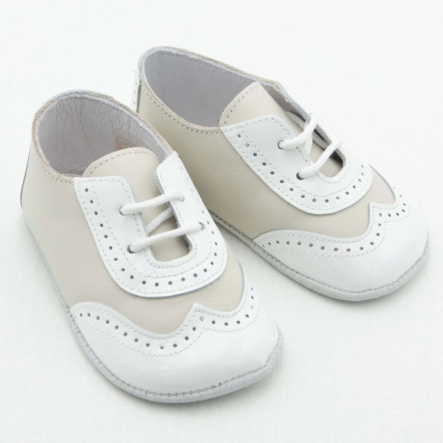 The Baby Beau & Belle Two Tone Boys shoes complete his outfit! These shoes are hand made for Baby Beau & Belle. They are made with a white patent leather and ivory matte leather with detailed edging for a handsome look. The bottoms are made with ivory suede leather. They also come in a variety of colors so you can match to our collections for that extra touch. Give his feet a special treat with the Baby Beau & Belle Two Tone Shoes.