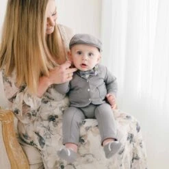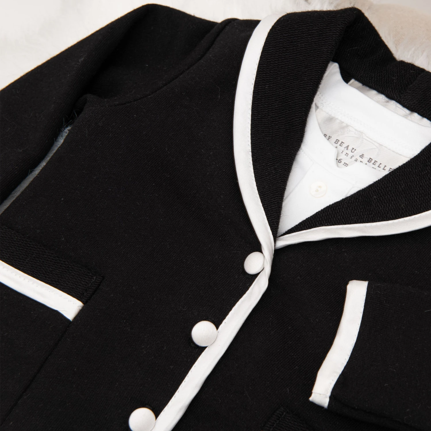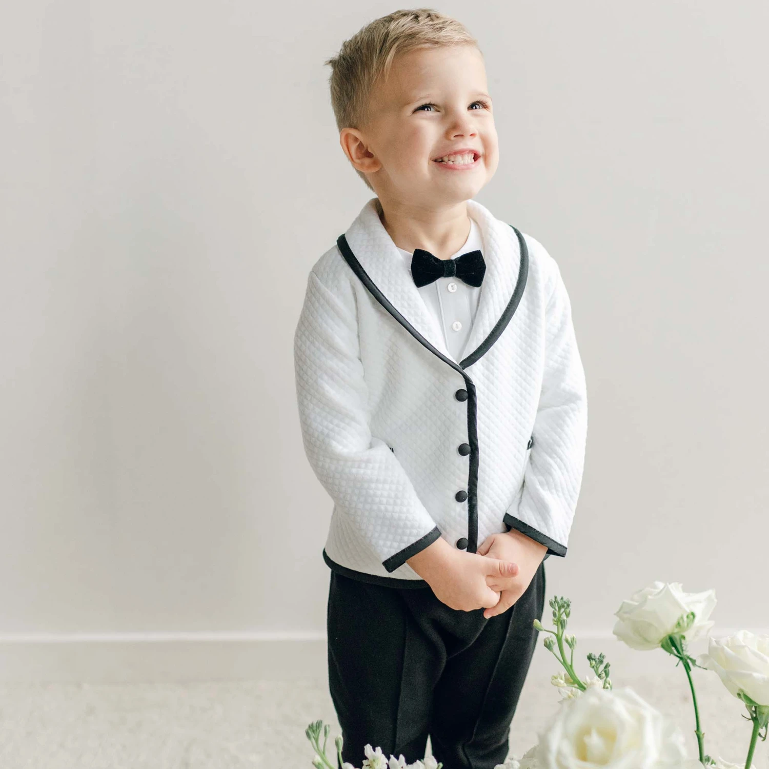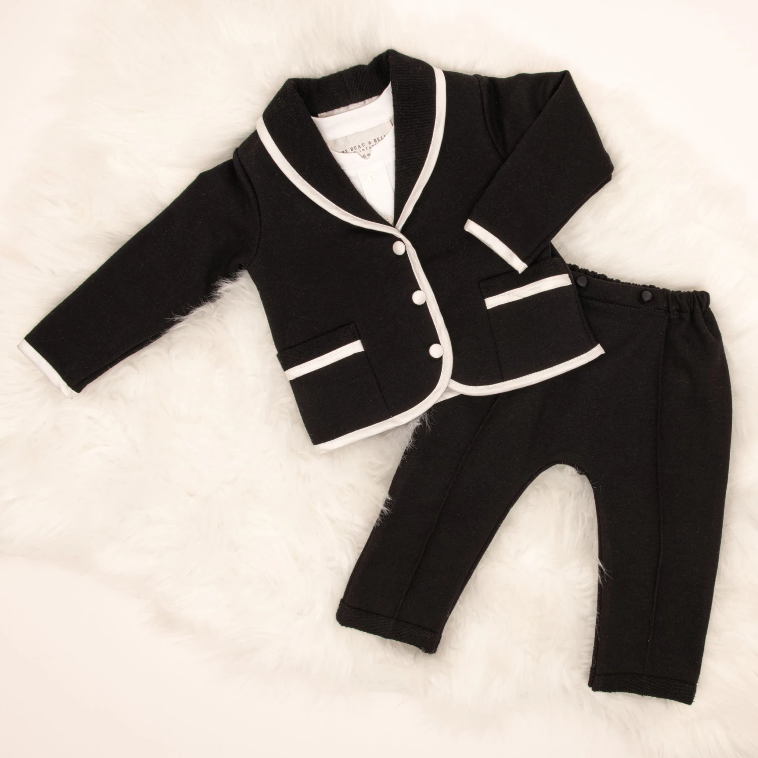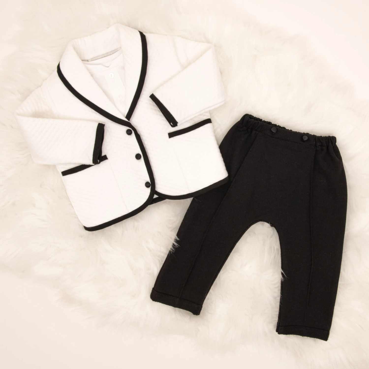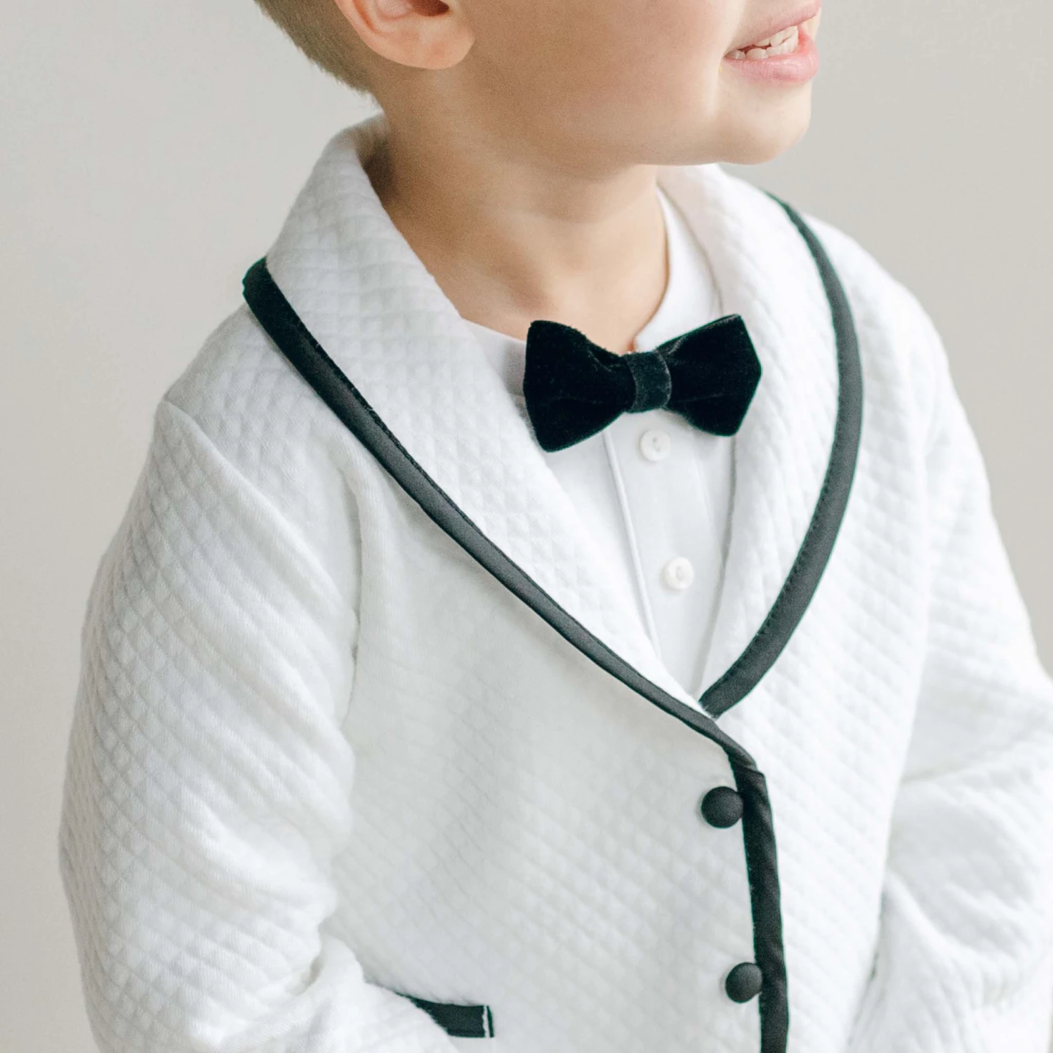 The perfectly chic baby boy suit for your little man! This tuxedo inspired set has been created with our softest cottons and rich Dupioni silk trim. This suit is available with a white quilted cotton jacket trimmed in black silk or a black French Terry cotton jacket trimmed in white silk, both jacket styles pair perfectly with black French Terry pants that create a more formal style. The baby boy 3-piece suit pants feature soft elastic for a comfortable fit around the waist. Double pockets on the jacket and one packet on the back of the pants makes for a very handsome look. Accented with silk covered summarys to match the jacket trim. This is the perfect baby boy suit for weddings or any major event.