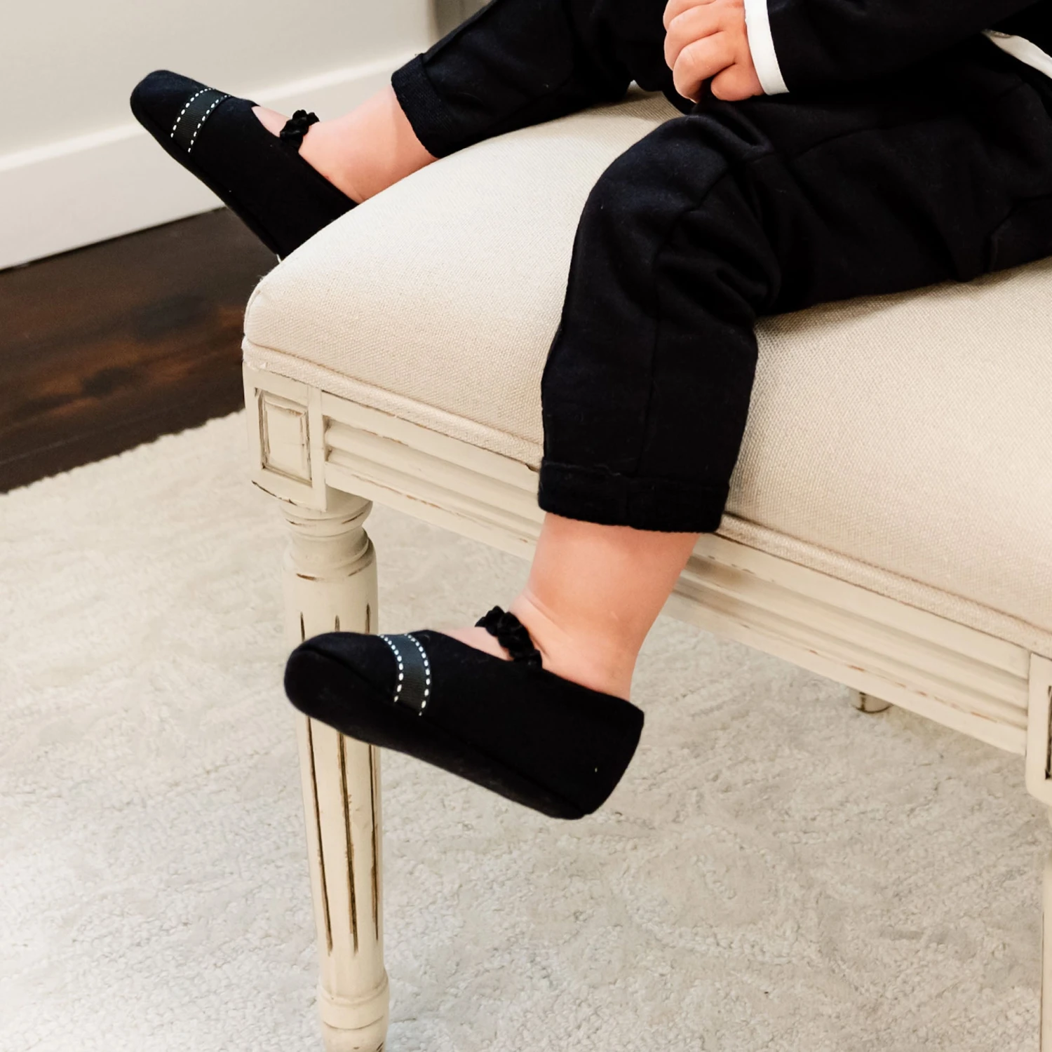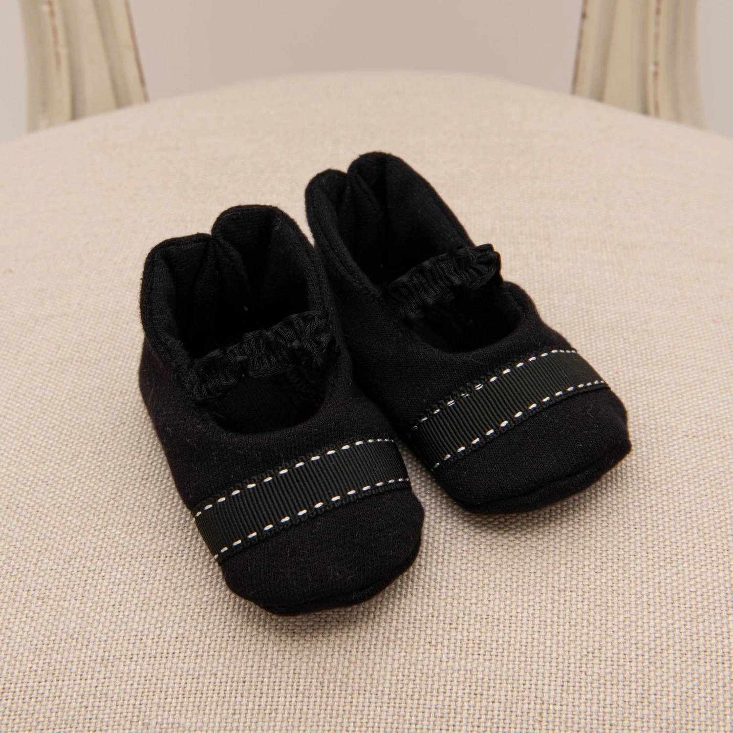 A beautiful pair of Boys Booties to compliment his James Suit! The James Booties are handcrafted with the same French terry used to make our James Suit! Made in our classic design for Boys Booties. Features black ribbon with contrasting white stitched detailing across the toe. Soft elastic across the foot helps make these booties a comfortable fit to wear throughout his day.
