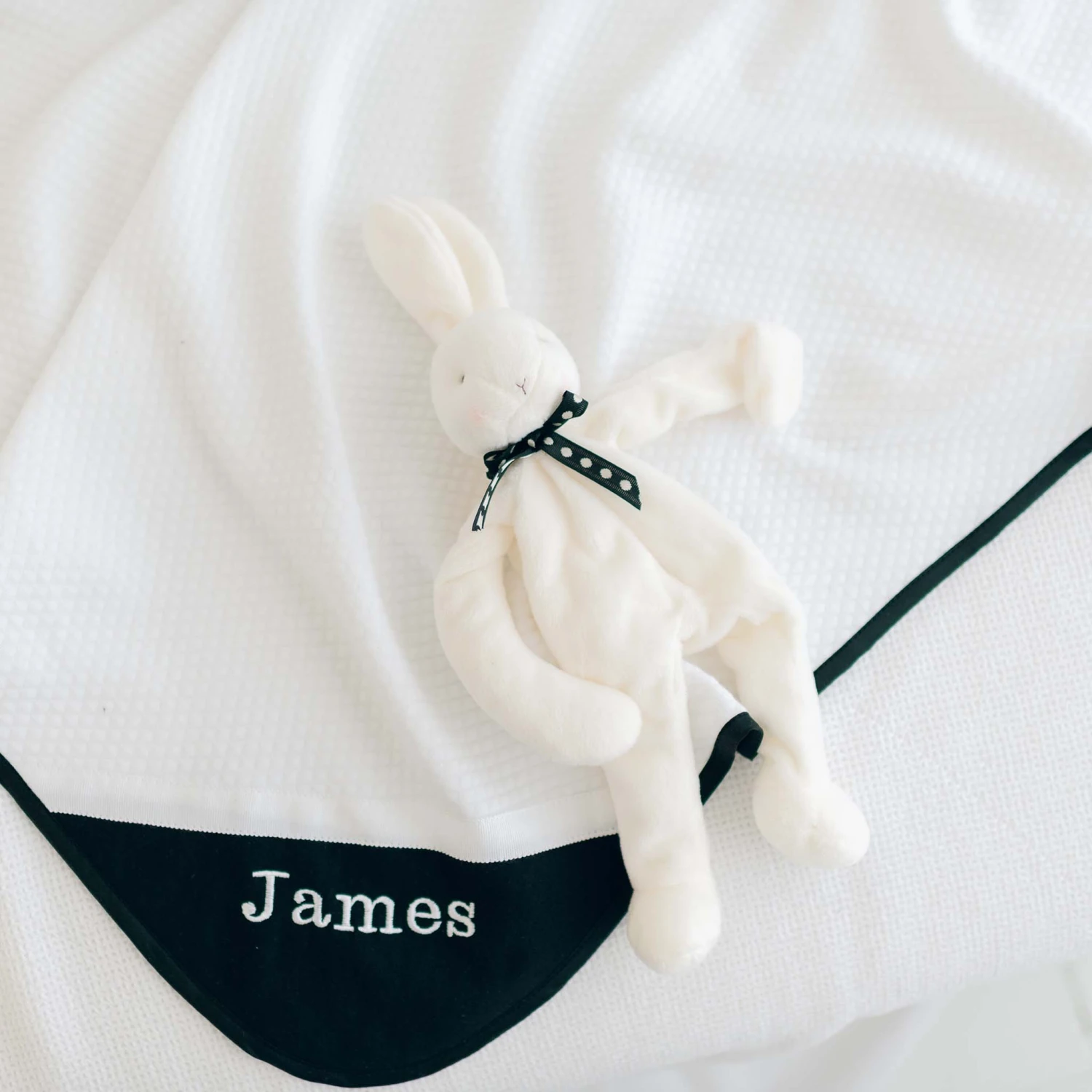 Give him a special blanket to snuggle up with on his big day. The James blanket is made with soft 100% white quilted cotton, one corner is detailed with white grosgrain ribbon and black french terry cotton for a handsome look. The edges are finished with black silk piping. We offer the option to embroider his name on the corner in white thread for a personalized touch that he will cherish for years to come. Makes a wonderful baby shower gift, take-me-home blanket, or even for a christening or baptism gift.