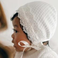 These adorable booties complete any Jessica collection outfit. Made of soft champagne lace with beautiful pastel floral appliqué across the front with added pearl style beading. White silk ribbon ties create a perfect fit and finish.