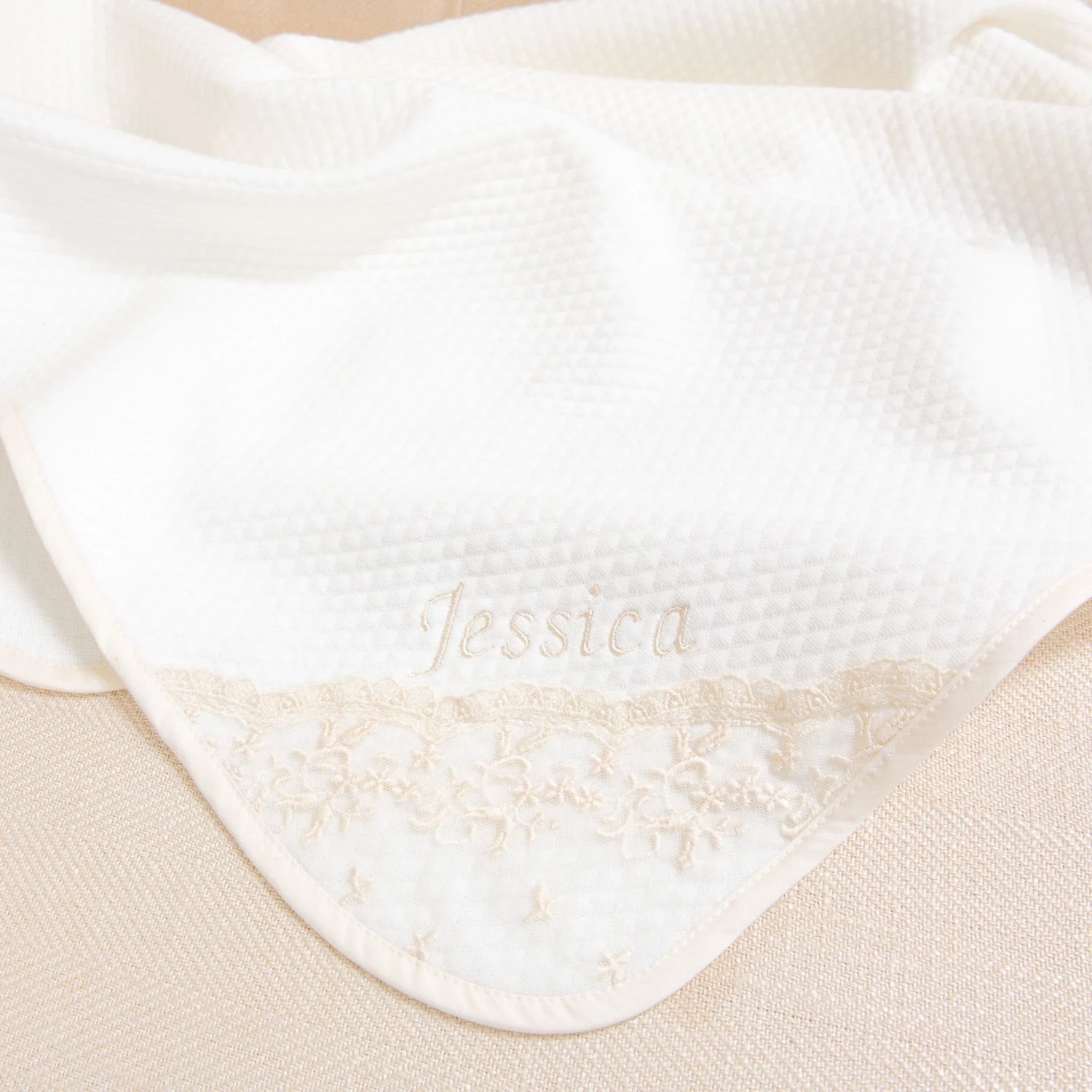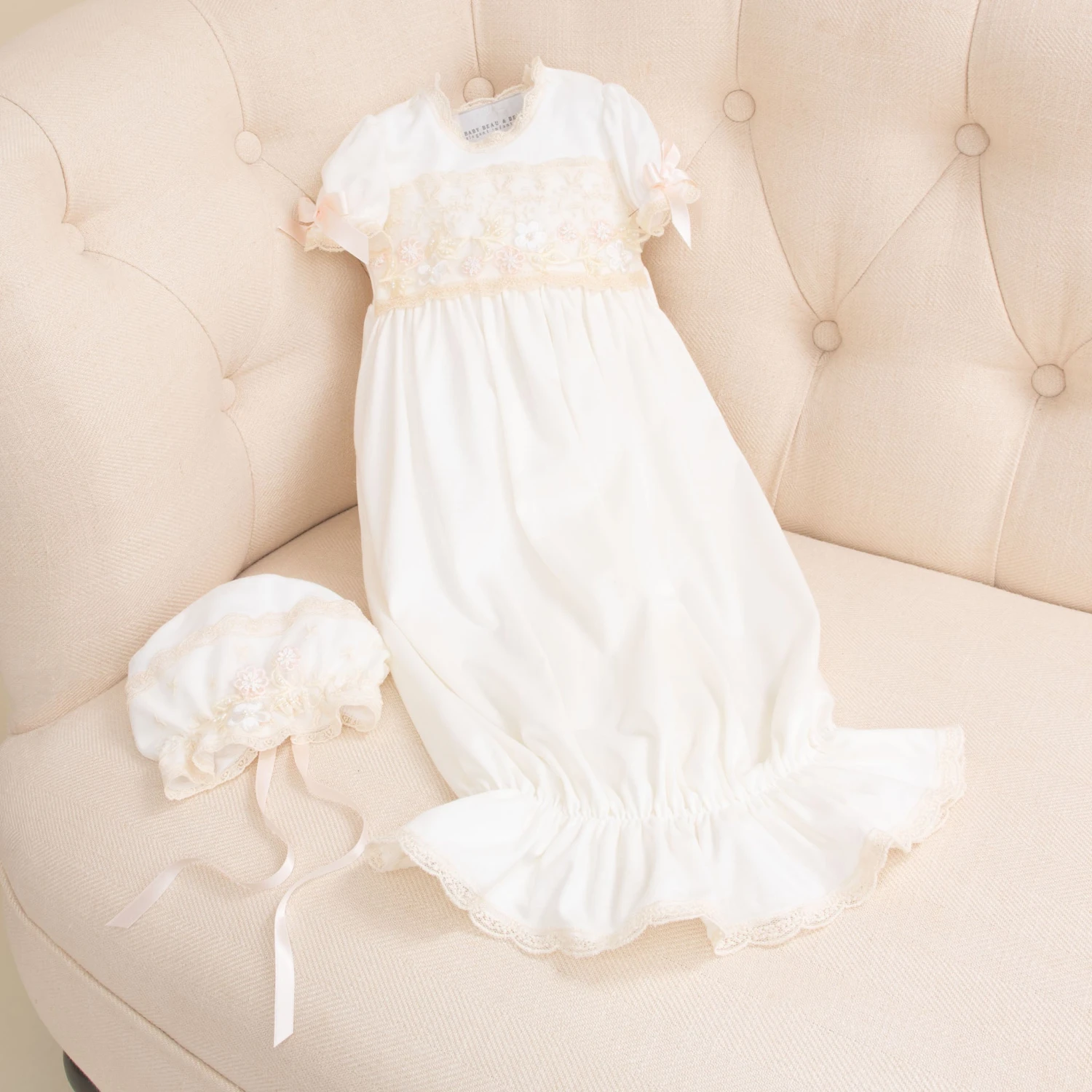 A lovely gift for your little girl! A beautiful gown set for a take me home outfit, baby blessing or any special event. Made from our soft ivory cotton which is perfect for her newborn skin. Our champagne embroidered netting across the bodice with floral appliqué with pastel pink and ivory flowers, pastel green vines and added pearl style beading makes for a gorgeous look. Pale pink silk ribbons on the sleeves and summarys on the shoulders add the extra special touch. Made complete with the matching soft cotton bonnet for the perfect head to toe look. Also includes her matching Jessica lace booties, super soft quilted cotton blanket with the option to have her name embroidered on the corner for a special keepsake and her bunny chime rattle to keep her company. This gown set also makes a wonderful shower gift!
