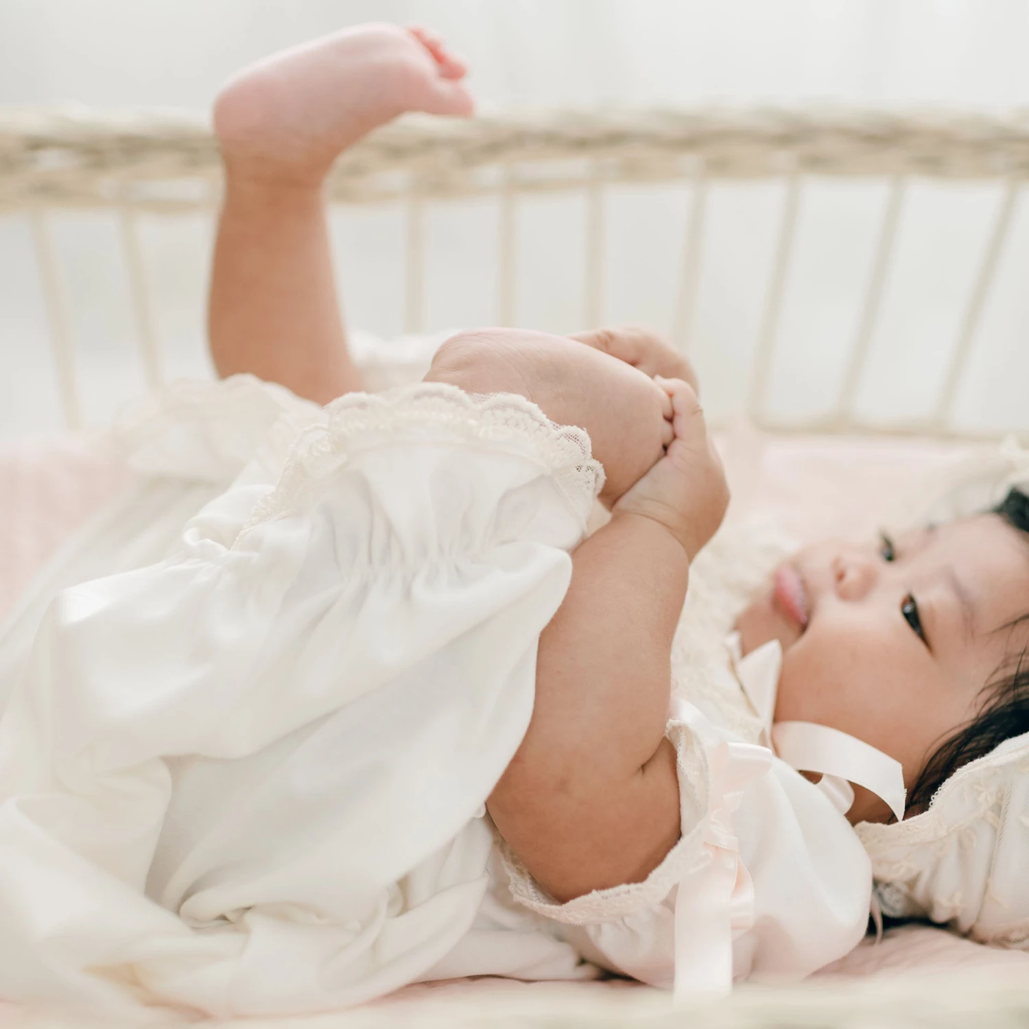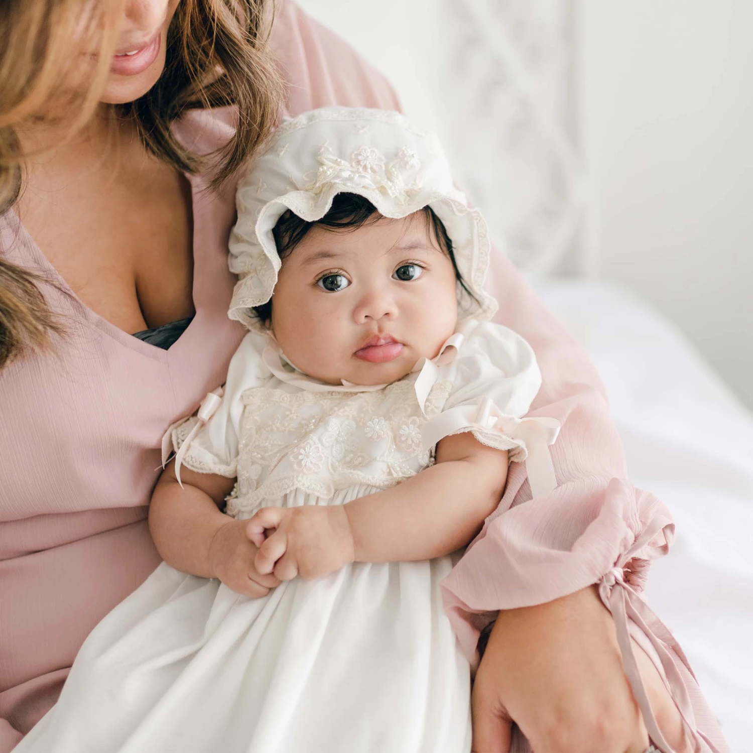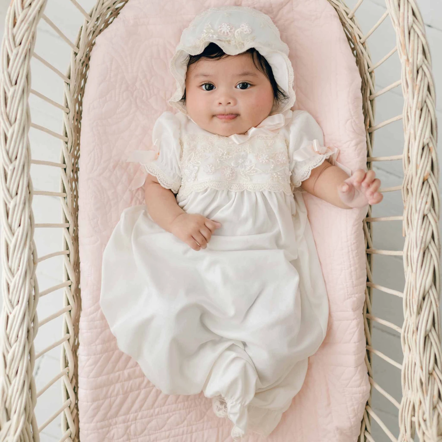 A lovely gown for your baby girl. Made from our soft ivory cotton which is perfect for her newborn skin. Our champagne embroidered netting across the bodice with floral appliqué with pastel pink and ivory flowers, pastel green vines and added pearl style beading makes for a gorgeous look. Pale pink silk ribbons on the sleeves and summarys on the shoulders add the extra special touch. Made complete with the matching soft cotton bonnet for the perfect head to toe look. Beautiful for a coming home outfit, baby blessing or any special event.