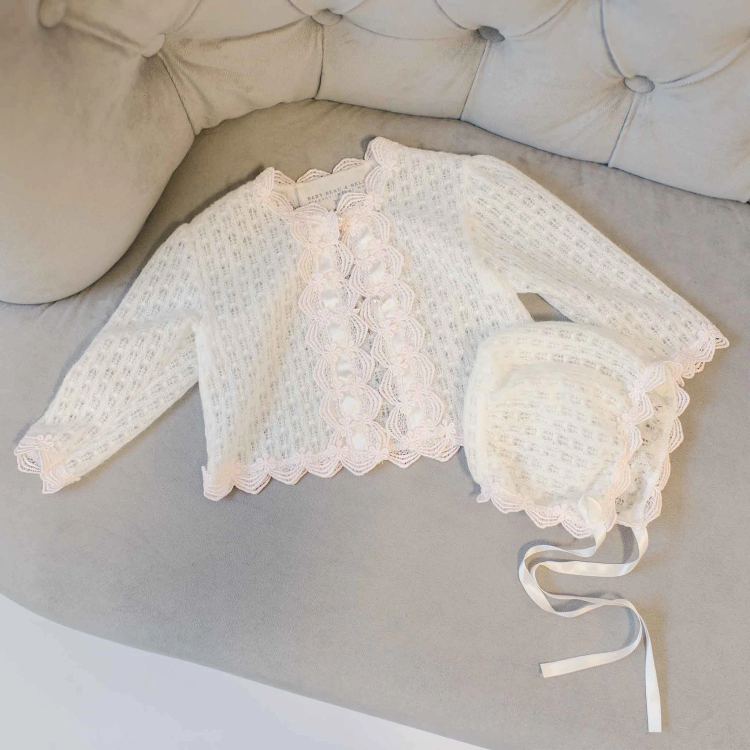 The Joli Knit Sweater & Bonnet are a perfect pairing to her Joli gown and dress! This darling sweater for baby girls is made with 100% knit in light ivory, a very soft material to keep your baby girl warm and comfortable. Venice lace trim in a soft shade of light pink details the edges and pearl style summarys at the front allow for a nice fit and special detail. Ivory silk ribbon ties are a beautiful extra touch to easily secure her bonnet. A lovely compliment to her Joli outfit and will also keep her warm and cozy.