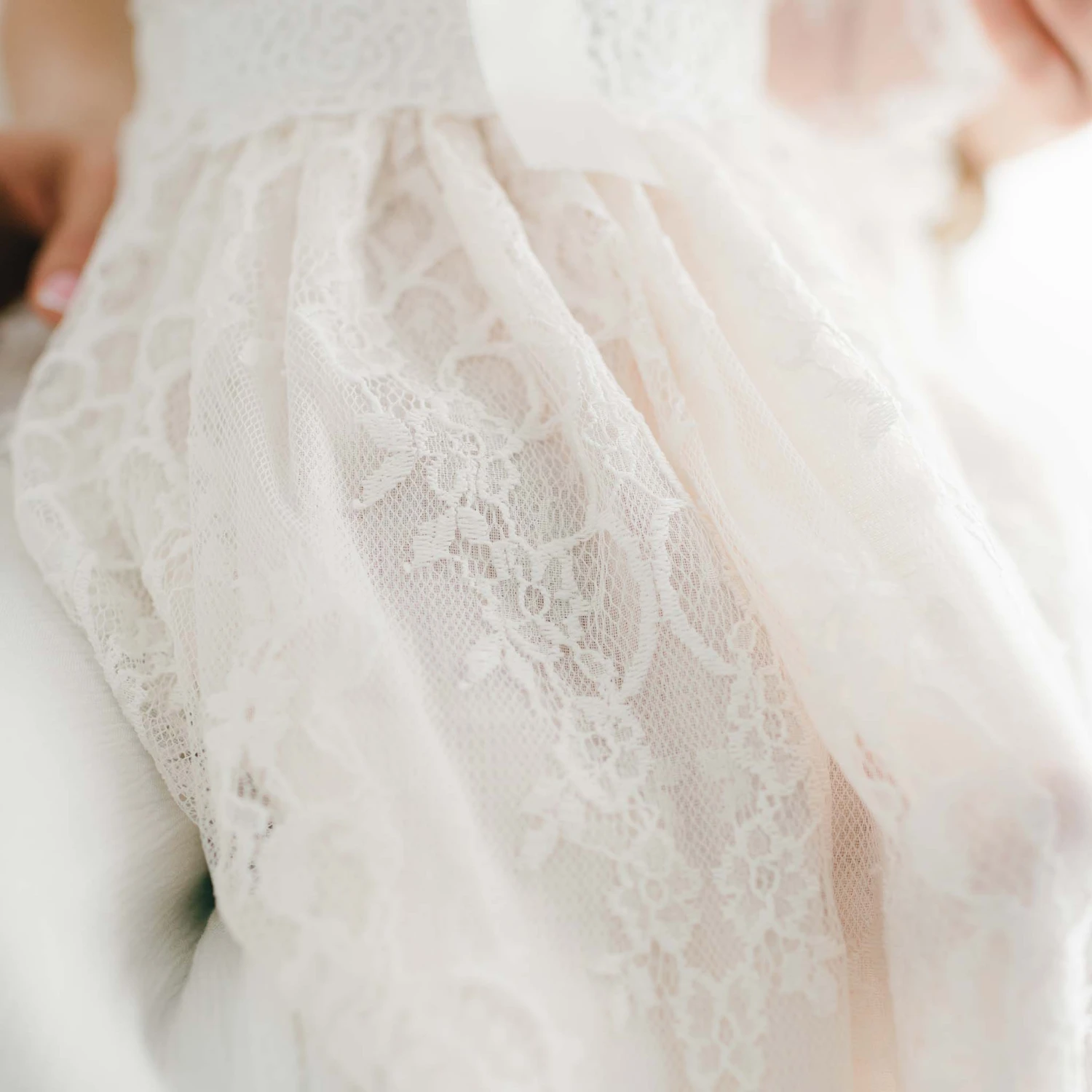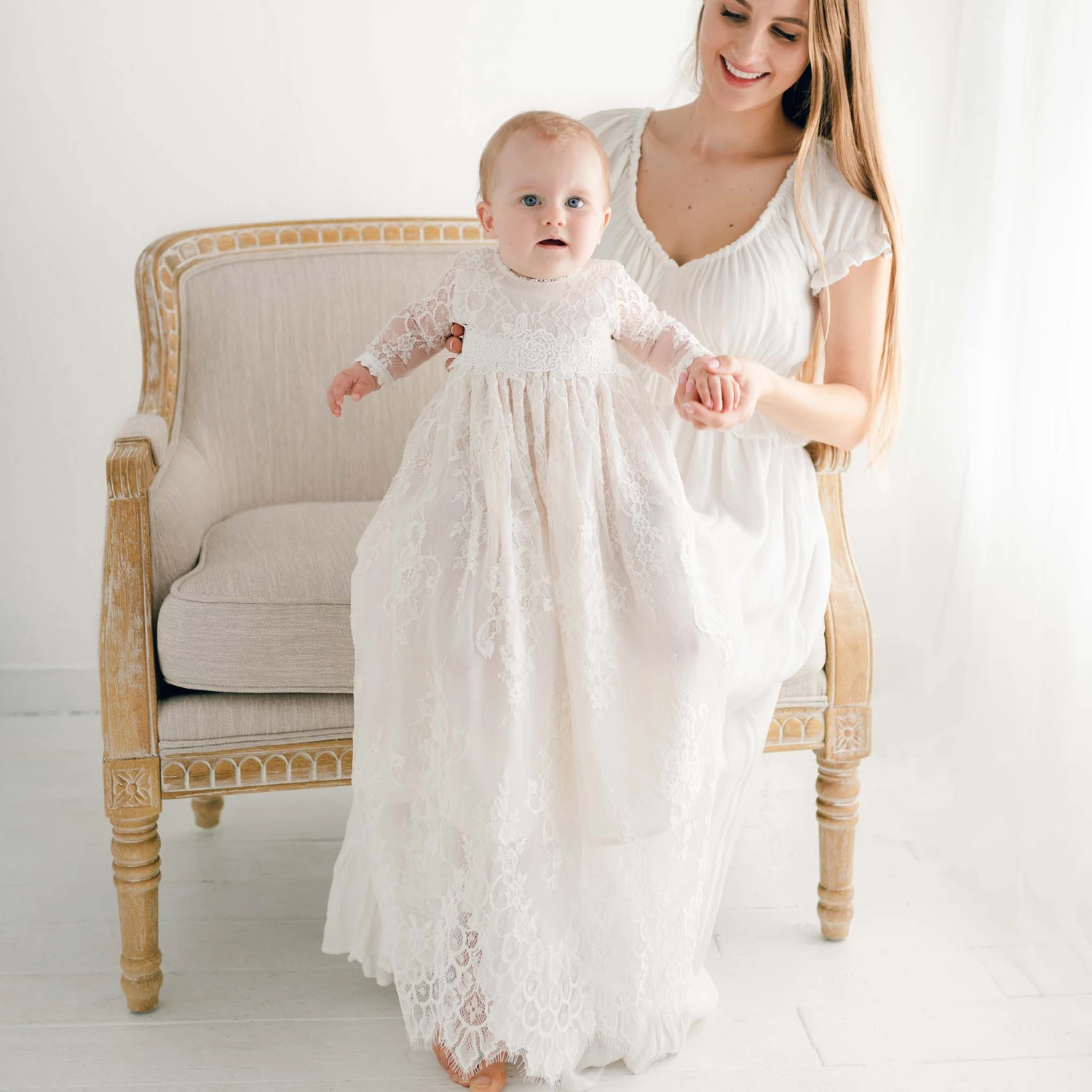As charming as it is adorable, the Juliette Christening Gown is made with a delicate floral pattern lace with super soft netting. Sheer lace sleeves designed to fall just to her wrist make it a perfect style for any season. A sweet rose lace details the waist which features a silk ribbon tie to create a perfect fit! Trimmed with a petite floral edge lace add a special touch. Button closure create a secure and comfortable fit. Includes her matching sheer lace bonnet to complete her look.