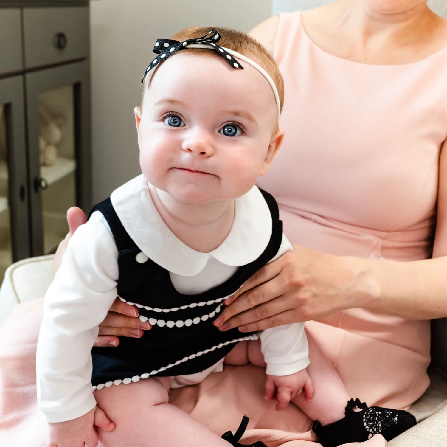 The perfect addition to complete her June look! These booties are made with our soft French Terry cotton in black to match her June romper dress, with black floral lace and wide white satin ribbon across the toe for a special detail! Black silk ribbon bows on the heels add a sweet touch. Soft elastic band along the top ensures a great fit!
