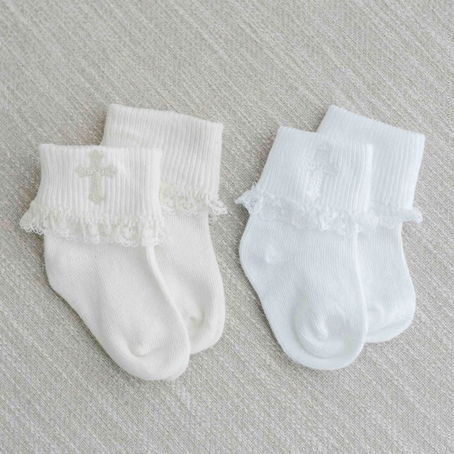 These Lace Cross Socks are made with a cotton blend for a comfortable fit with embroidered cross and lace edging. The perfect compliment to any of our outfits.