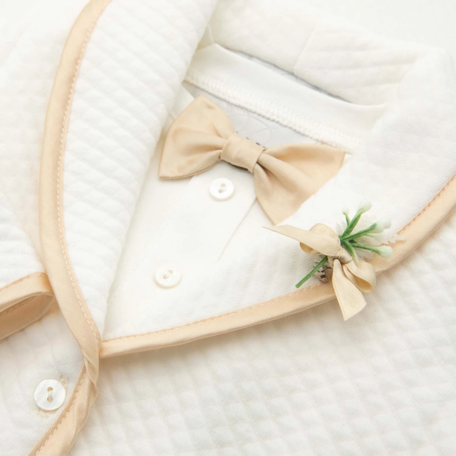 Add some flair to his look with this dapper silk bow tie and matching boutonniere. Made from the same champagne dupioni silk used to trim his Liam suit, these stylish accessories are easy to attach and add the perfect finishing touch. The bow tie features a convenient alligator clip, while the boutonniere can be securely fastened with its locking pin back. The possibilities for his formal ensemble are endless!