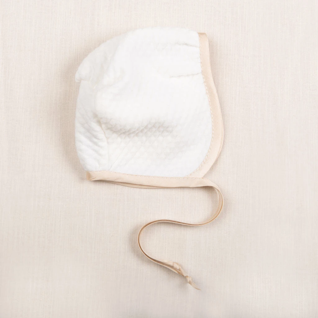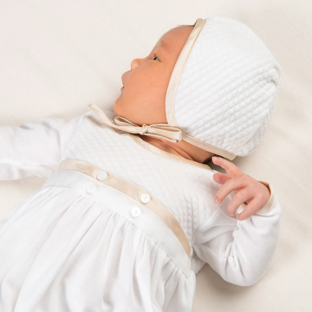 This classic boys baby bonnet is the perfect finishing touch to his Liam take home outfit. Made with our soft quilted cotton in ivory, it is trimmed with silk in the most gorgeous shade of champagne for a vintage pop of color. It perfectly matches his Liam newborn gown or jumpsuit, yet is simply styled for any coming home outfit. Champagne silk ties under the chin allow for a comfortable fit. An adorable traditional baby bonnet to keep your newborn baby boy warm and styled.