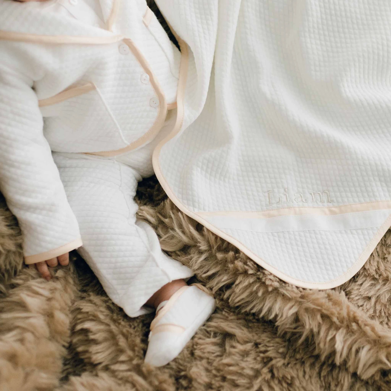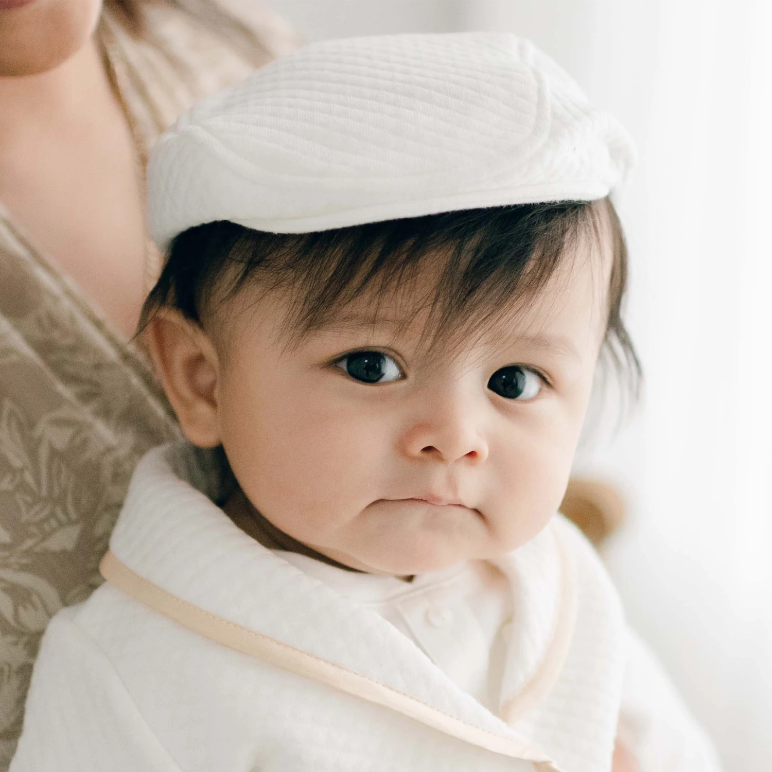 All the pieces needed to complete your Liam baby boys outfit are available here in this convenient package, and at a special discounted price. This accessory set includes his matching ivory quilted newsboy hat and Liam booties so he is styled from head to toe. It also includes the Liam bib to protect his special occasion outfit from messes, and his personalized quilted blanket with his name embroidered in champagne thread on the corner for a gift he will cherish for years. A perfect set for any special day, whether it’s used as a wedding suit for baby boys, first birthday pictures, or a unique boys baptism outfit. Makes a handsome baby shower gift set too. Save 15% over purchasing these pieces separately.