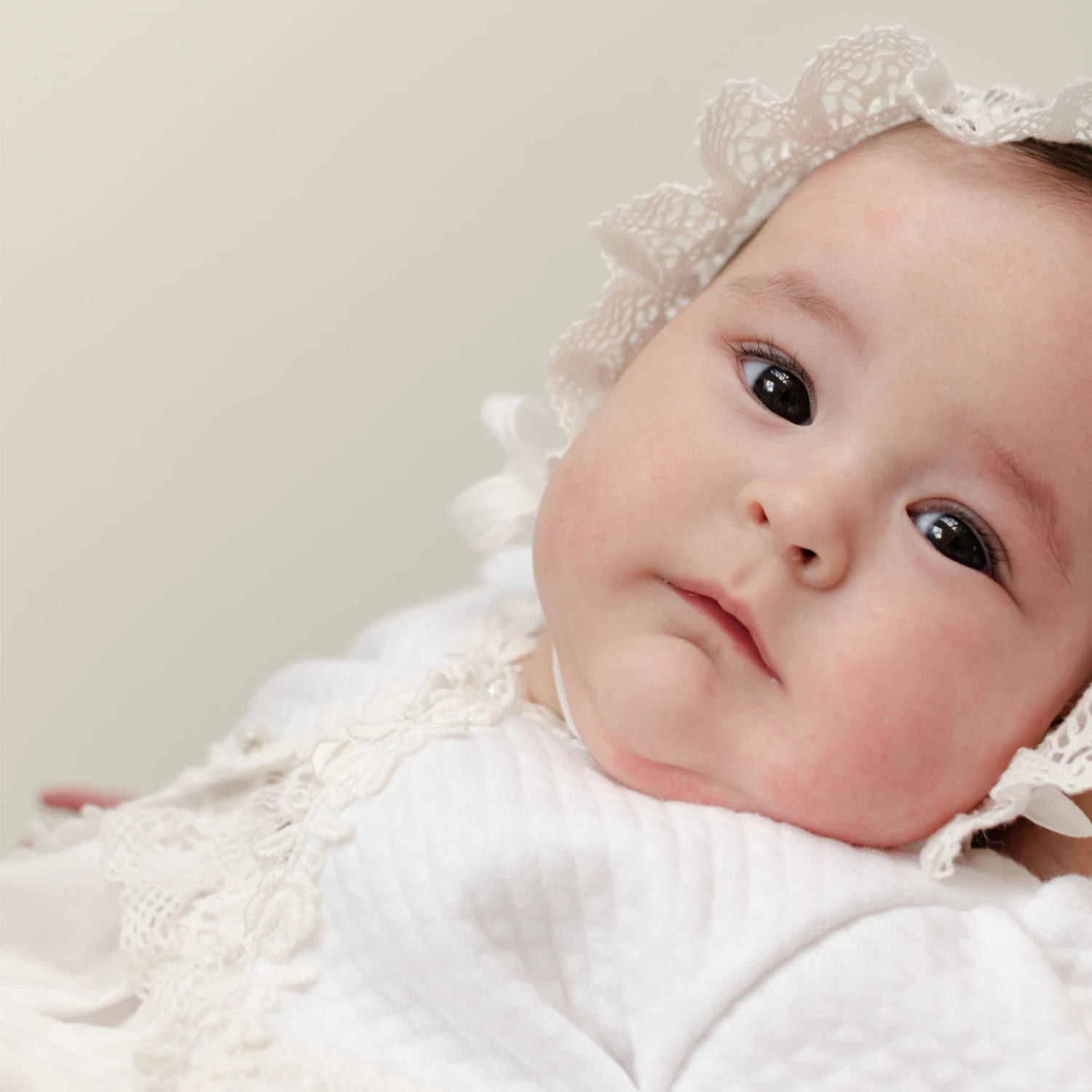 A timeless style that will perfectly compliment any outfit! Made of light ivory quilted cotton so its super soft against baby’s skin. Soft stretch lace lace trim in light ivory add a cute ruffle detail to sweetly frame her face. When paired with the matching quilted cotton sweater you have the perfect set to go with her Lily gown and dress.