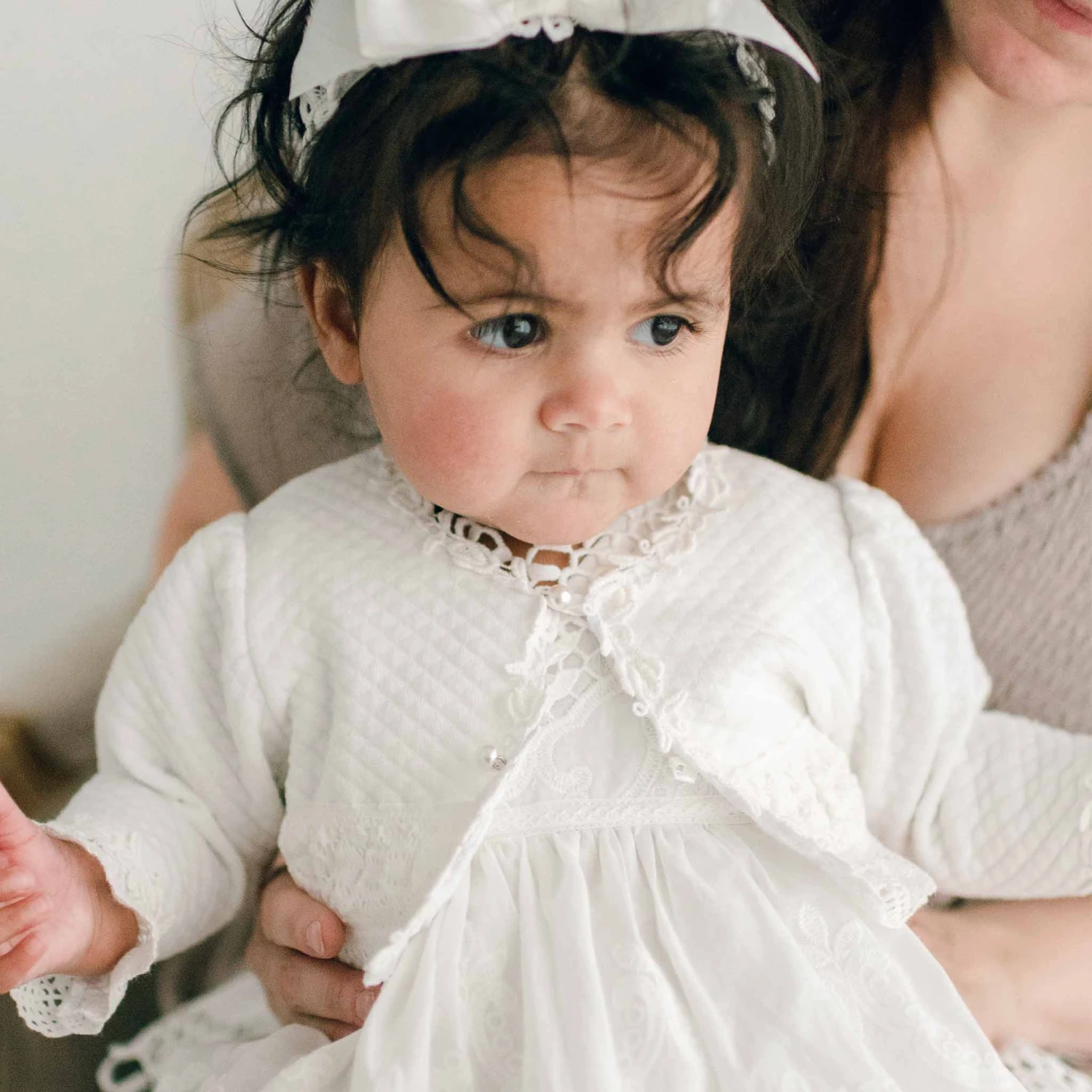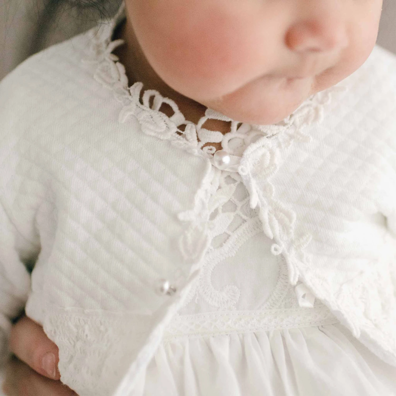 A timeless style that will perfectly compliment any outfit! Made of light ivory quilted cotton so its super soft against baby’s skin. Soft stretch lace lace trim in light ivory add a cute detail. Wrist length sleeves so she’s fully covered, and pearl style summarys are very sweet to keep it fit to her. Bodice accented with ivory rose and vine lace for elegance. When paired with the matching quilted cotton bonnet you have the perfect set to go with her Lily gown or dress.
