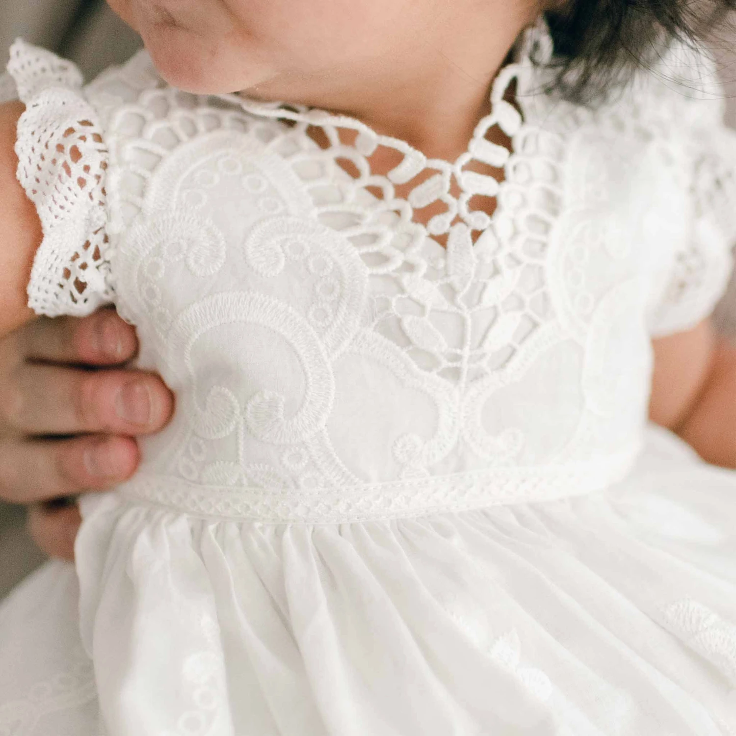 A delicately detailed cotton lace with a scalloped edge layered to create a simply elegant look for her special day! Lightly ruffled lace sleeves are a perfect touch to the lace bodice. Pair with her matching Lily accessories to complete her look.
