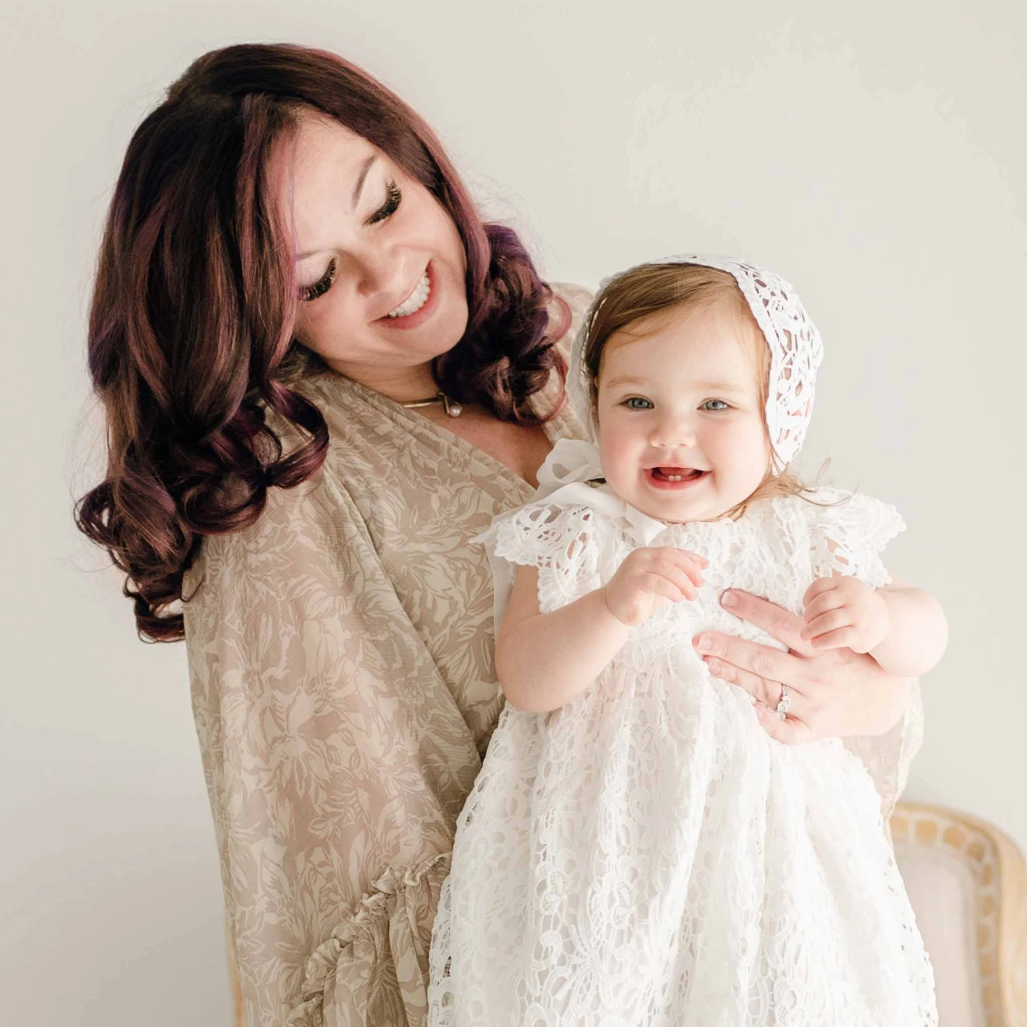If you’ve been searching and wondering how to choose a christening gown, look no further. You will not find a more beautiful full-length christening gown. The Lola baptismal gown is hand-crafted down to the last detail. Made with a cotton undergown in light ivory featuring an all-over lace overlay for a detailed look not found on most gowns. Lace bodice with cap sleeves add to the uniqueness of the gown. Ties in back with a sash. Includes matching lace bonnet so she has her complete look.
