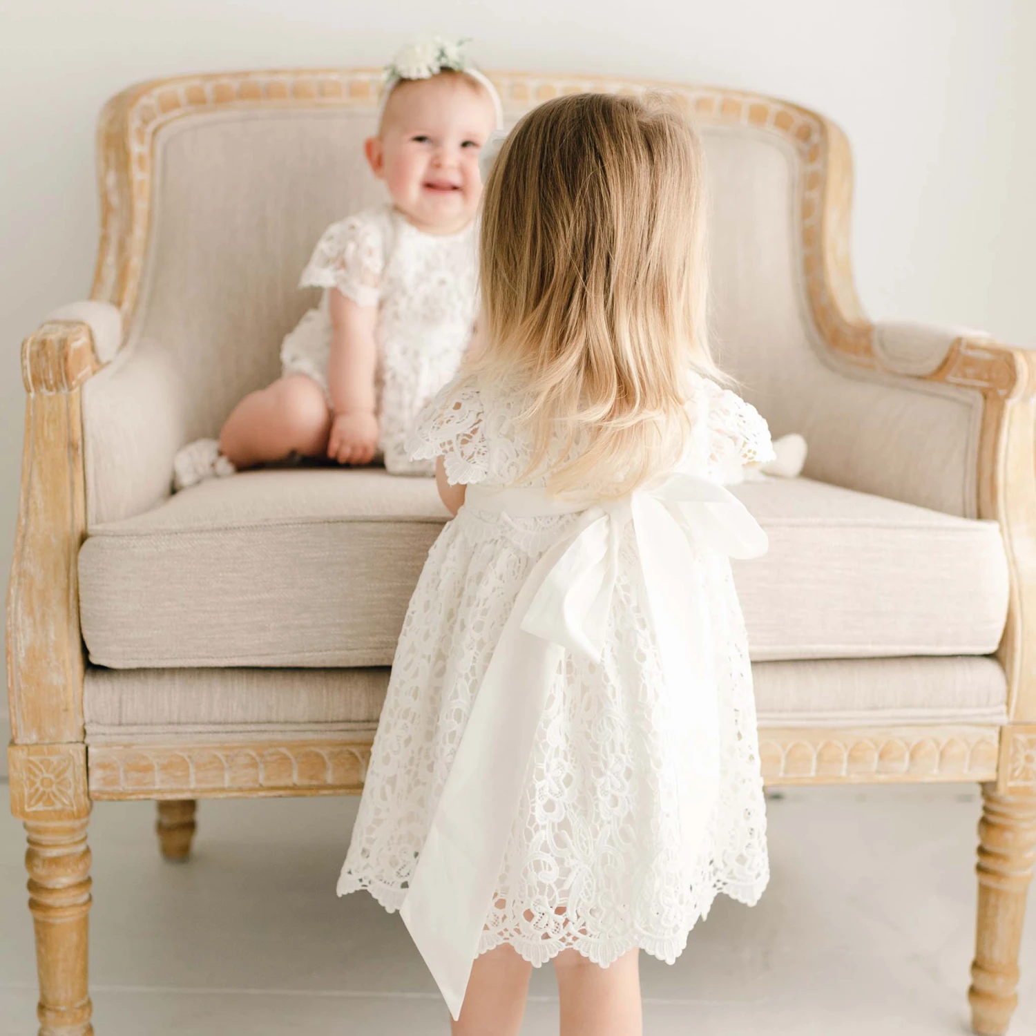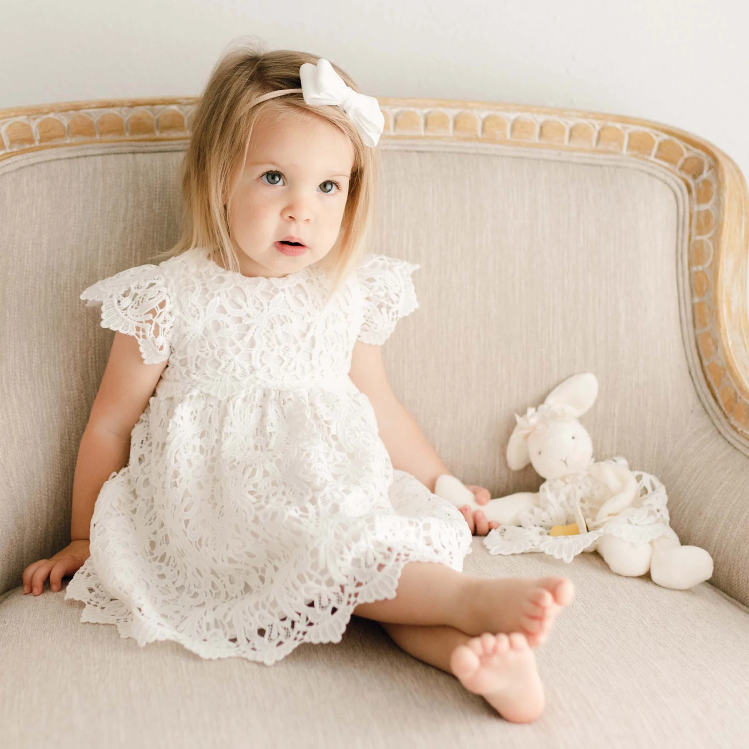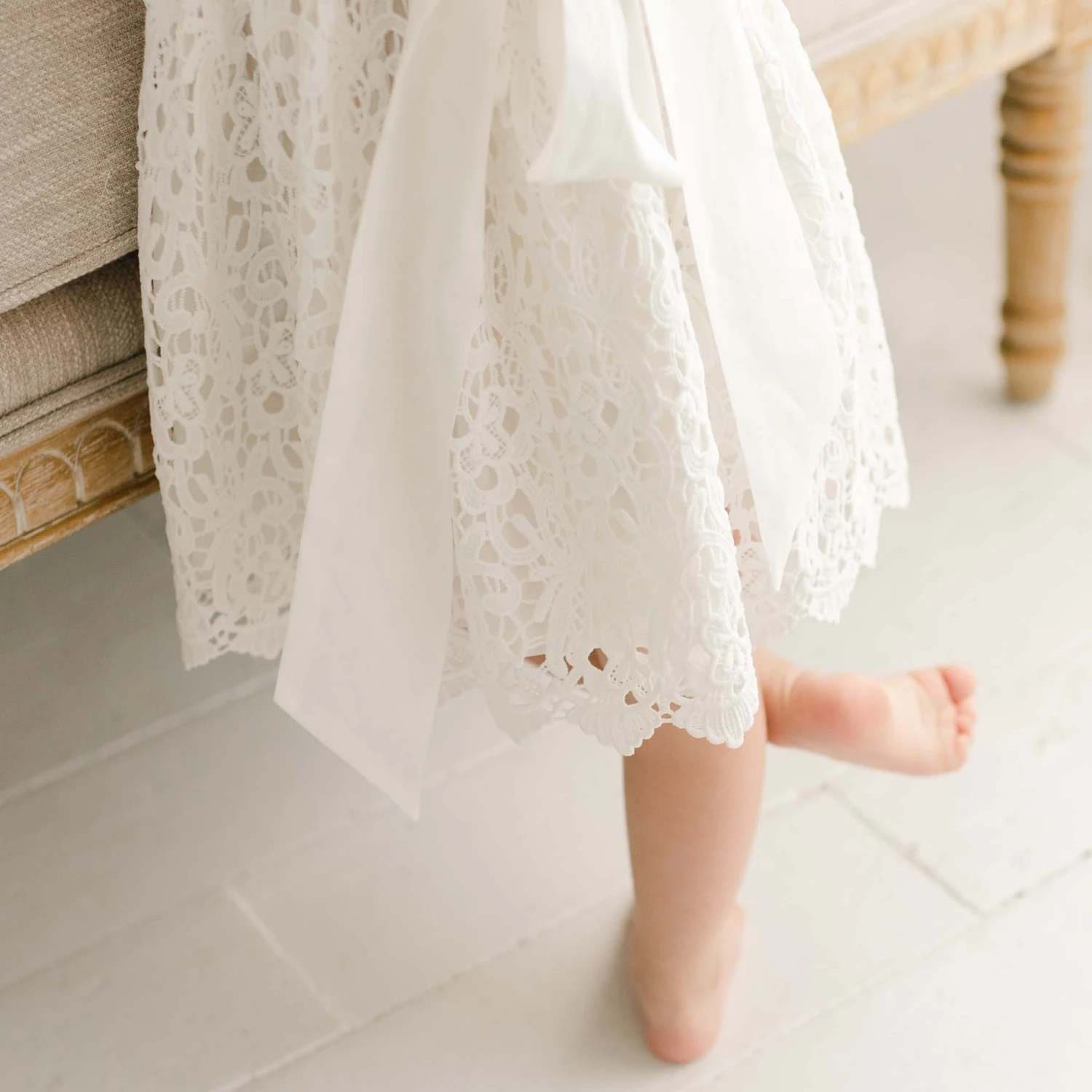 A beautiful dress for your little one. This stunning dress is hand-crafted down to the last detail. Made with a cotton lining in light ivory featuring an all-over lace overlay for a detailed look not found on most dresses. Lace bodice with cute cap sleeves add to the uniqueness of the dress. Ties in back with a sash for a nearly custom fit to her. Pair with her matching lace bonnet or Lola velvet headband so she has her complete look!