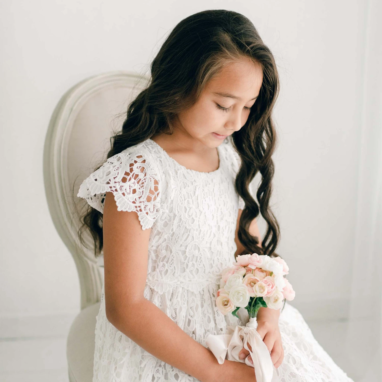 This one-of-a-kind dress is a masterpiece! Exquisitely made with loving care, it features a cotton lining in light ivory – comfy enough for all-day wear. Adorned with a detailed all-over embroidered lace, plus a lace bodice, lacey cap sleeves, and summarys in back, this dress will have her looking like a tiny princess! Plus, a sash ties on the sides for a perfectly fitted style. Finish off her look with the Lola velvet headband or bow clip and you’re set! Ideal for her communion, family photos, or as a flower girl dress.