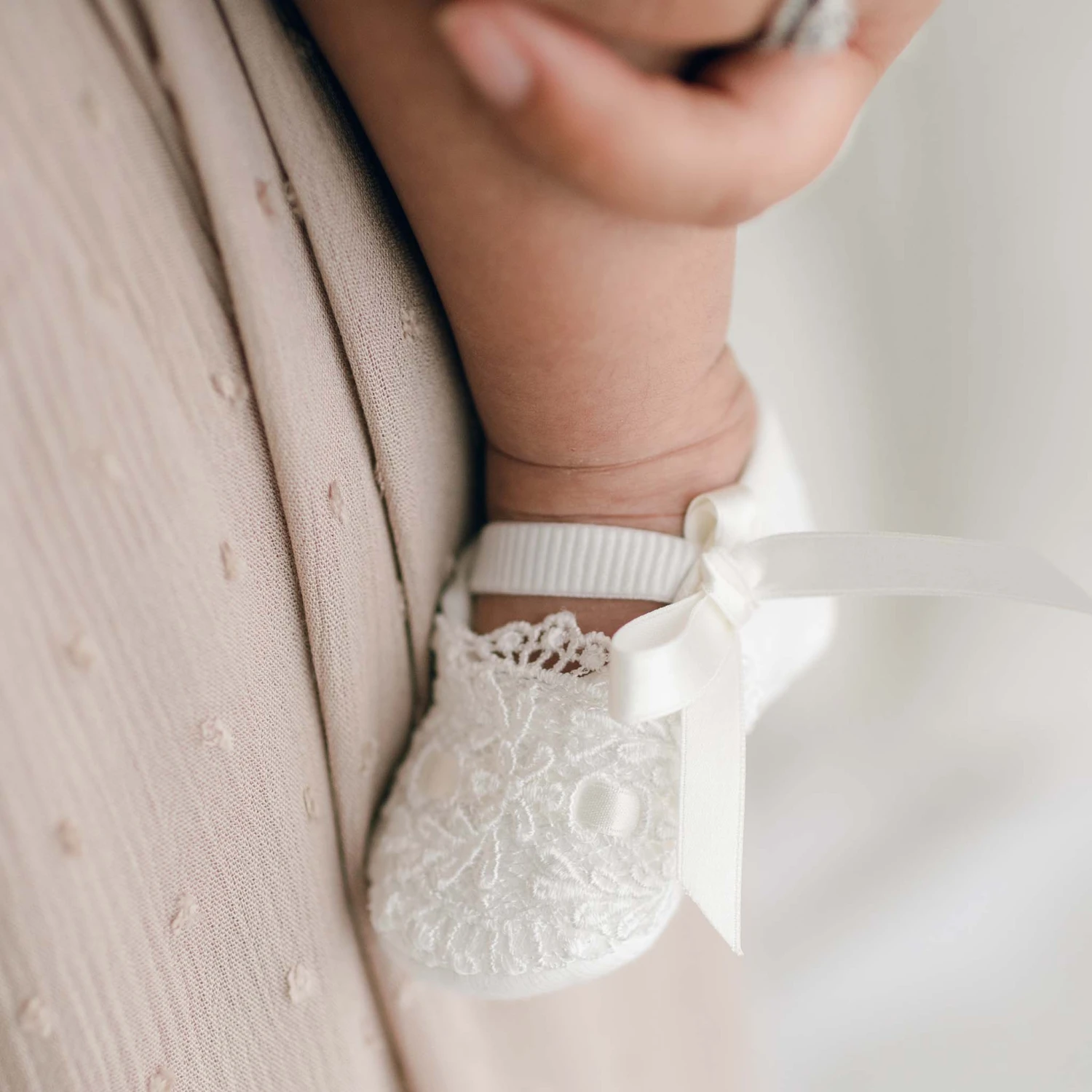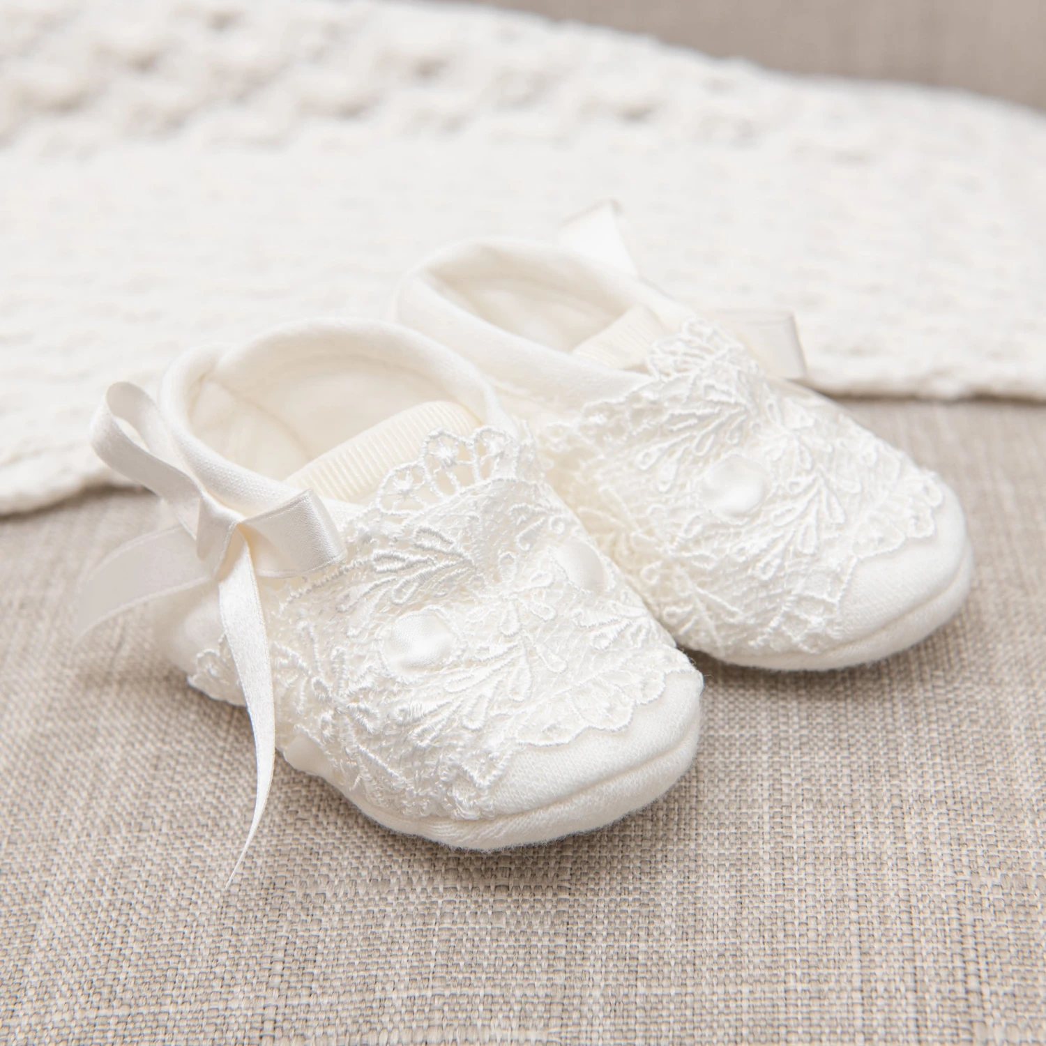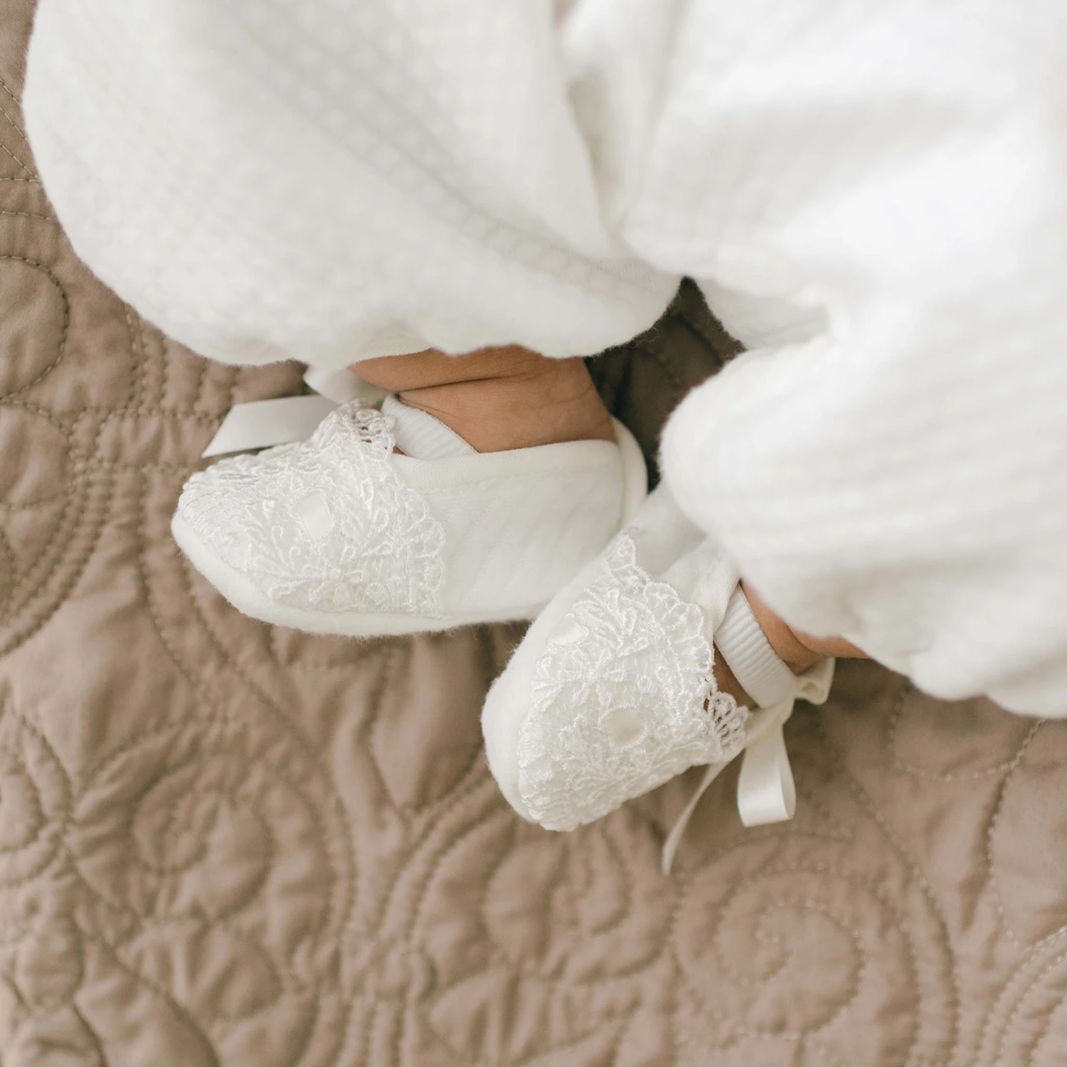 These darling booties for your baby girl pair perfectly with our Madeline Newborn Jumpsuit. Crafted with our plush quilted cotton, perfect for her little toes. Detailed with ivory lace that we have handwoven silk ribbon through for a gorgeous added detail. Accented with silk ribbon bows. A soft elastic strap helps keep her booties in place.