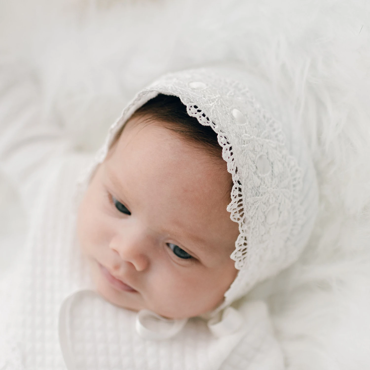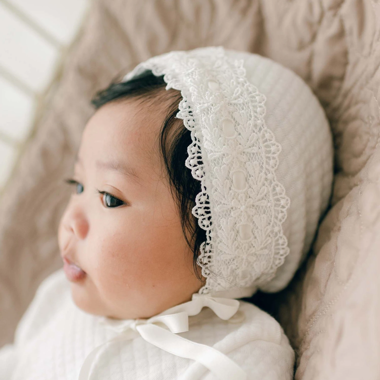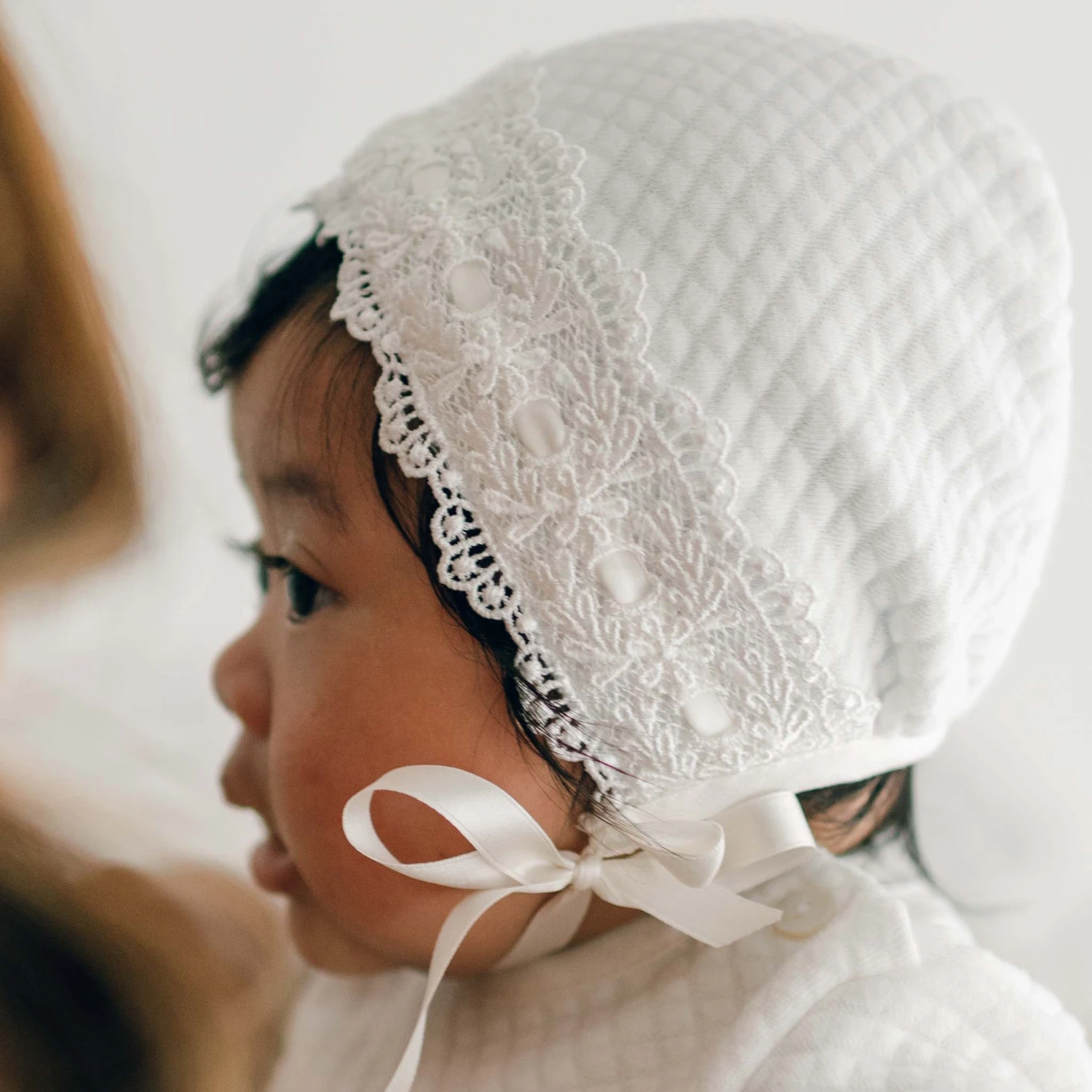 Our Madeline Bonnet was made special for your newborn girl. Crafted with our plush quilted cotton in a fitted style bonnet that will keep her warm. Detailed with a gorgeous scallop that we have handwoven silk ribbon throughout for a unique and intricate detail. Completed with silk ribbon ties for a perfect fit. The perfect compliment to her Madeline Newborn Jumpsuit.