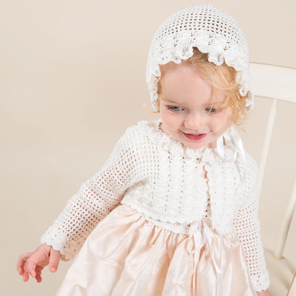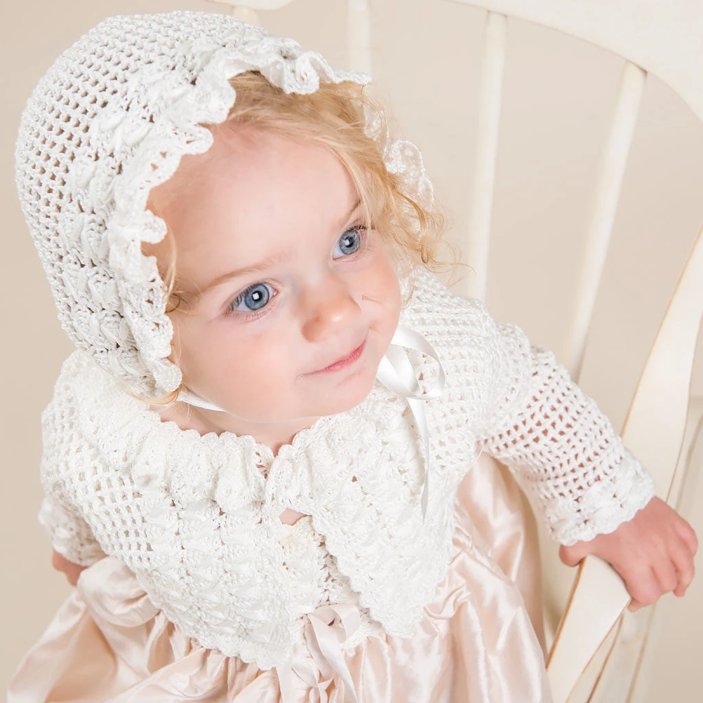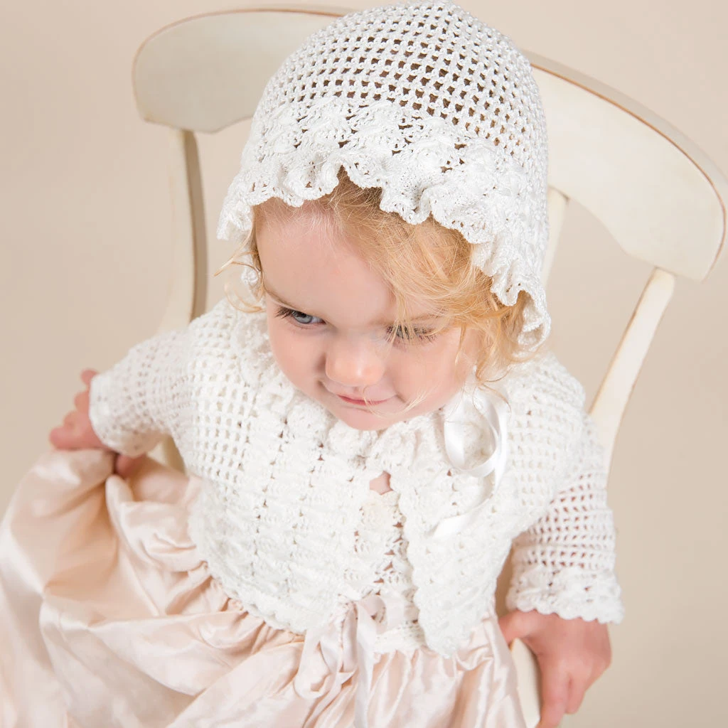 A unique sweater set to add to your collection. The Marita sweater and bonnet are made from light ivory mercerized cotton (the finest in the world) and hand loomed for us in Peru. Two summarys help secure while only adding to the beauty. Another unique item found only with Baby Beau & Belle.