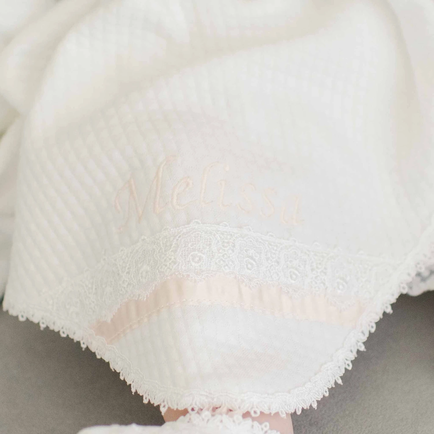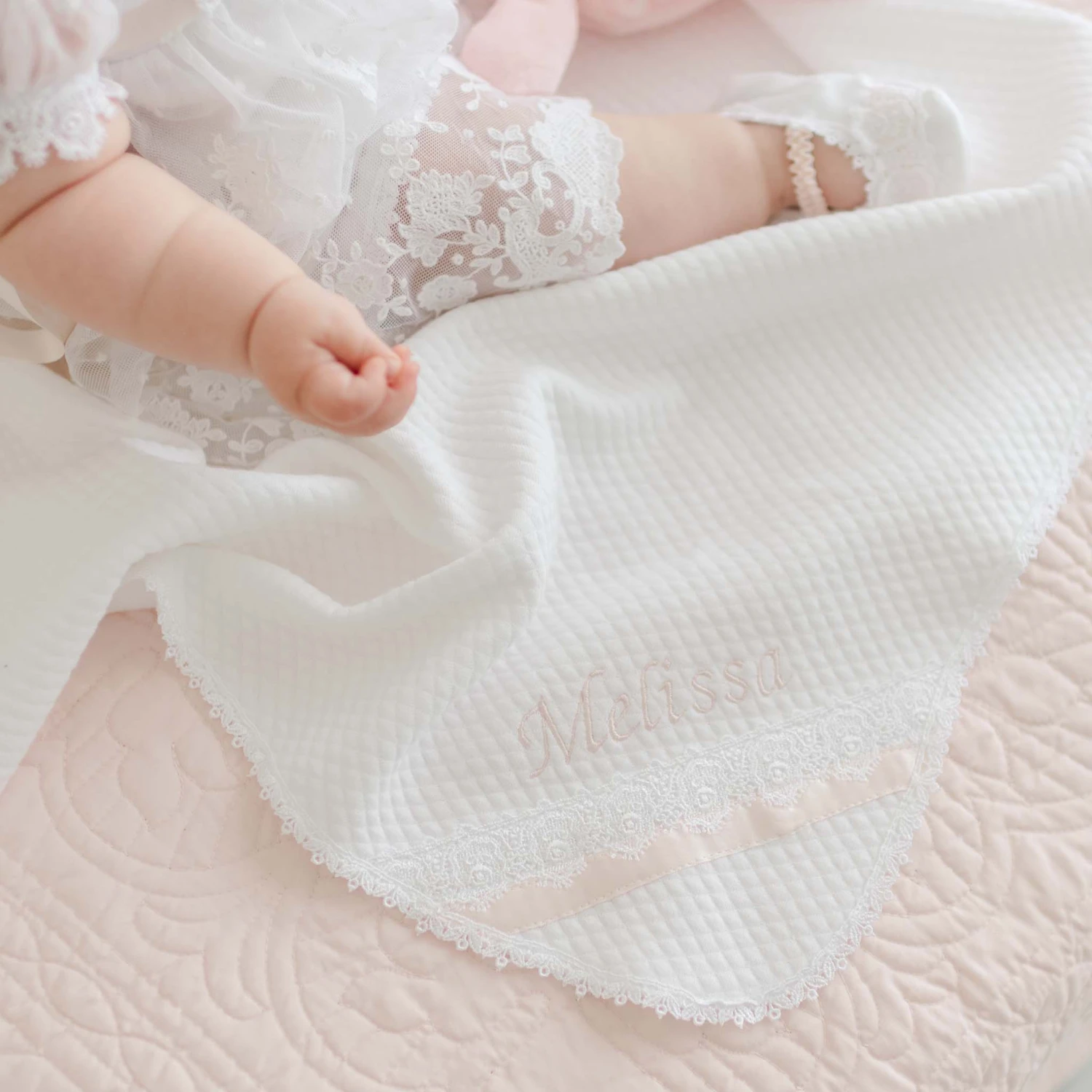 A beautiful addition to her Melissa outfit. This blanket is made of our soft, 100% quilted textured cotton in white. Venice lace trim borders all the way around. Pretty accent corner with a beautiful lace and soft pink silk ribbon. Add that extra special something to any outfit or her Christening Gown.
