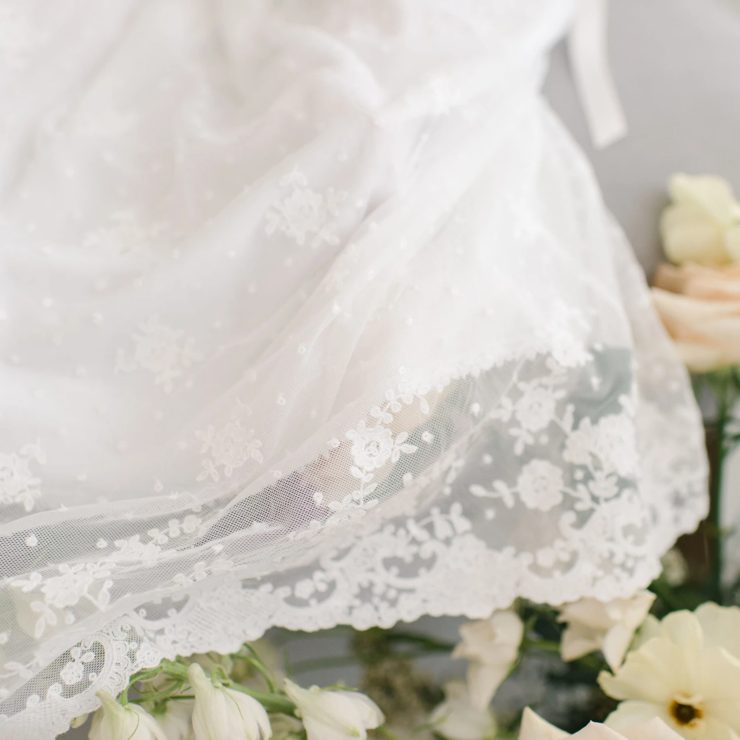 - Dotted Swiss/floral border embroidered pattern netting overlay