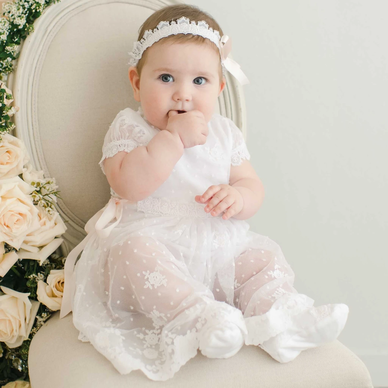 A lovely dress for your little girl. Perfect for girls baptism or any special event. Made of our pima white cotton so it’s soft for baby, this one piece romper is made to fall just about knee length depending on height. Skirt falls mid-calf to ankle length featuring dotted Swiss/floral border embroidered pattern netting. White Venice lace trim adorns the sleeves, neck and ankles. Pale pink silk ribbons at the bodice add an elegant touch and can be tied for a nearly custom fit! Cute pearl style summarys ensure easy fitment at shoulders. She is sure to look her best for her special day in the Melissa collection!